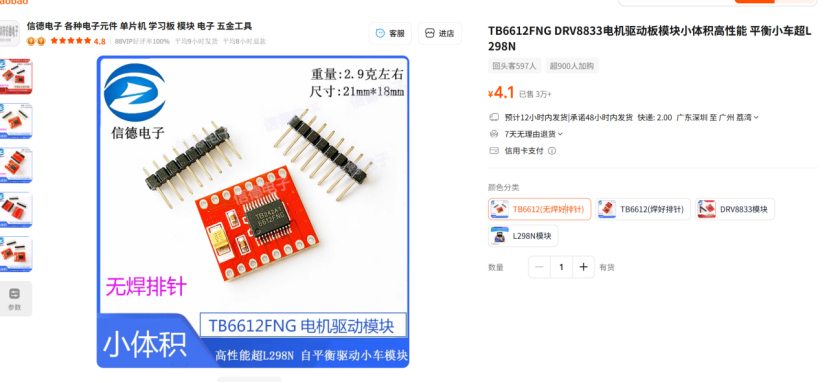 如下图,特点是红色的模块,注意不要买优信的TB6612模块,它上面钽电容的耐压值是10V,会炸。建议买下图信德电子的。