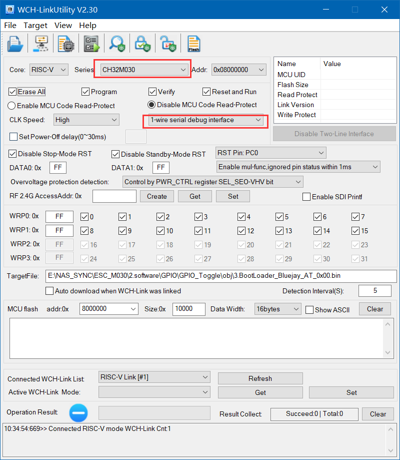 然后使用WCH-LINKE,用5V连接+,GND连接-,DIO连接DIO,由于其支持单线下载,不需要连接CLK,CLK可以复用为打印或者TLM接口。通过WCH-LinkUtility软件,选择M030,并通过单线下载。