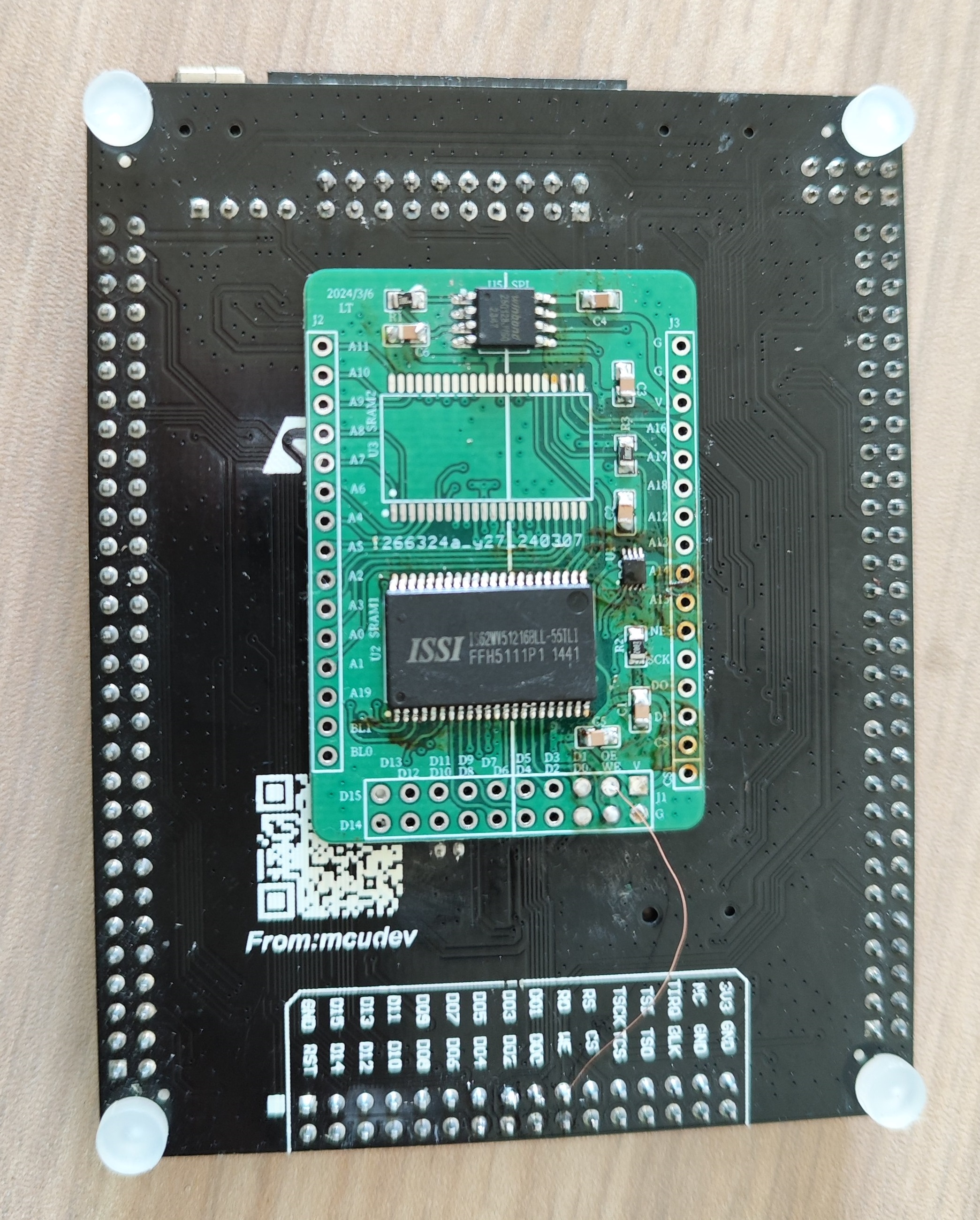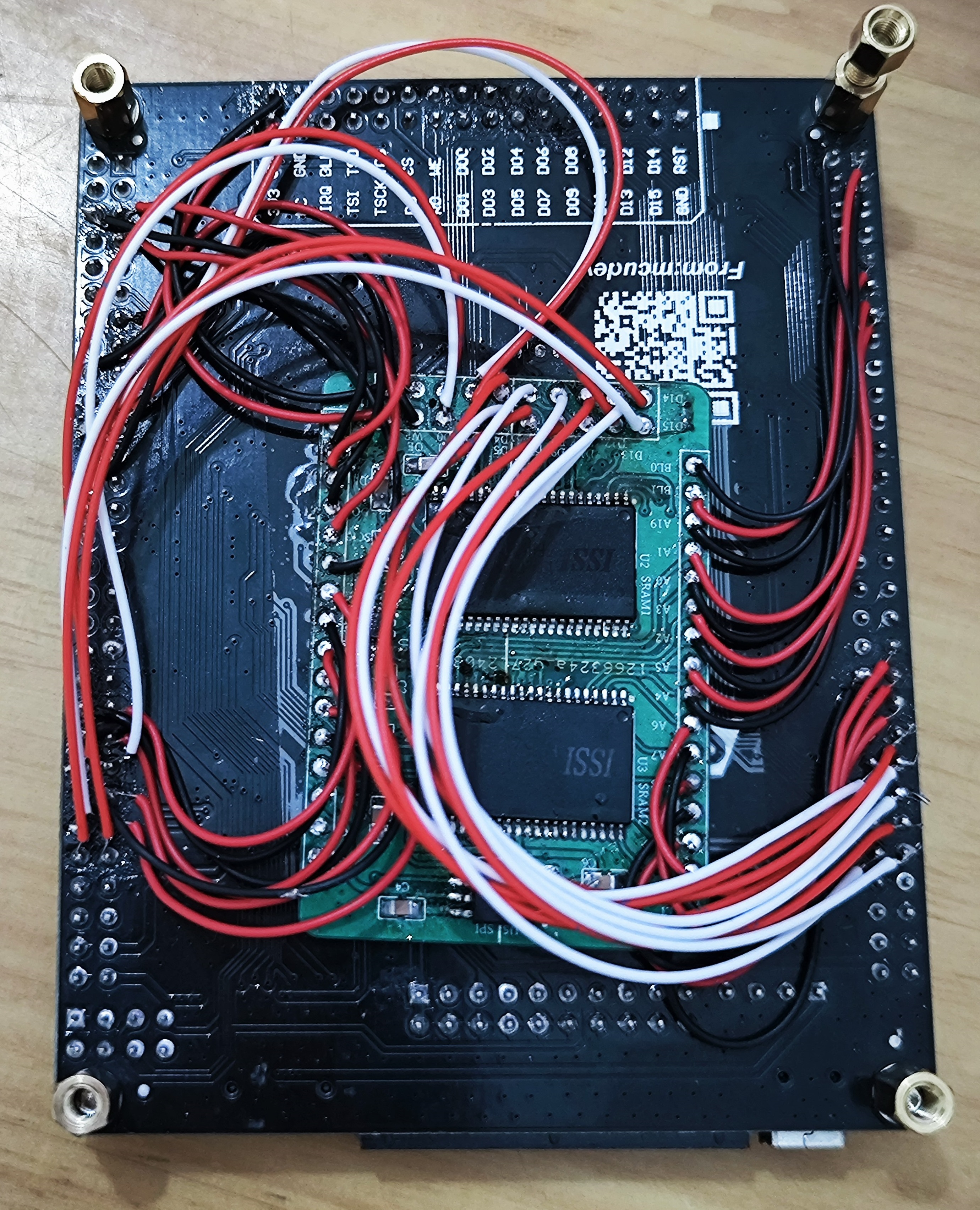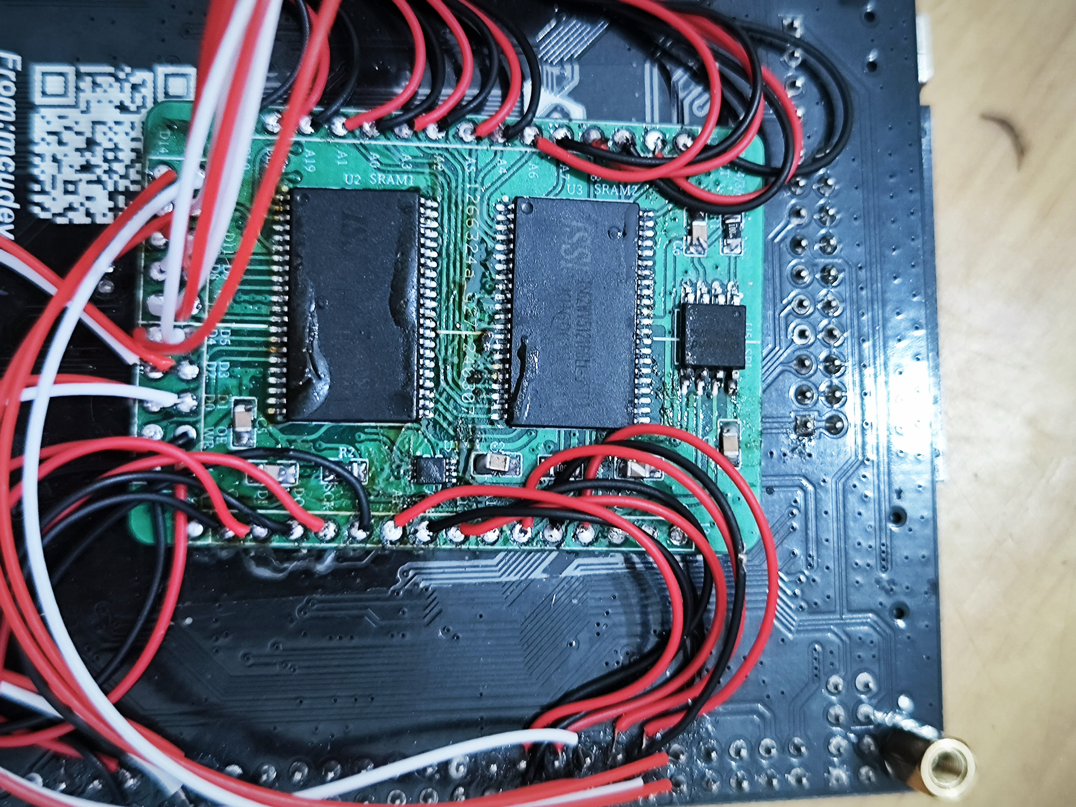 能力有限,PCB用了四层板。为了方便,地址线、高低八位数据线没有按顺序连接,没有影响连。通过飞线连接到主板的引脚。一开始使用的这种细小飞线,难焊还无法使用,最后换成大根的线。
