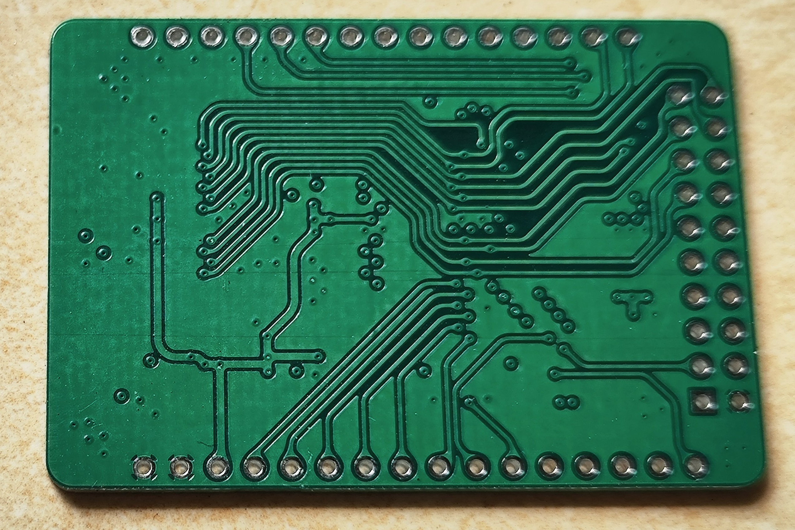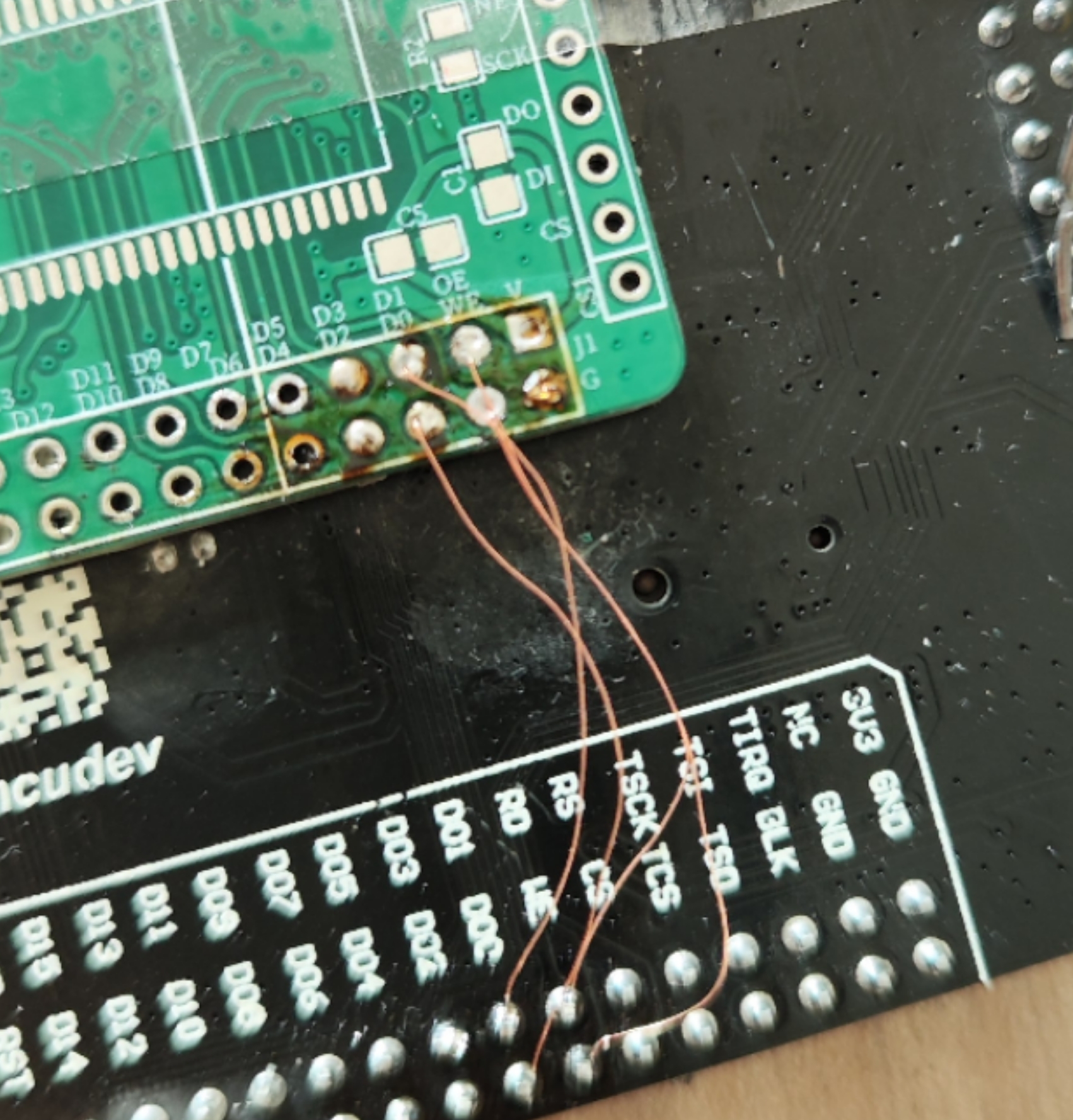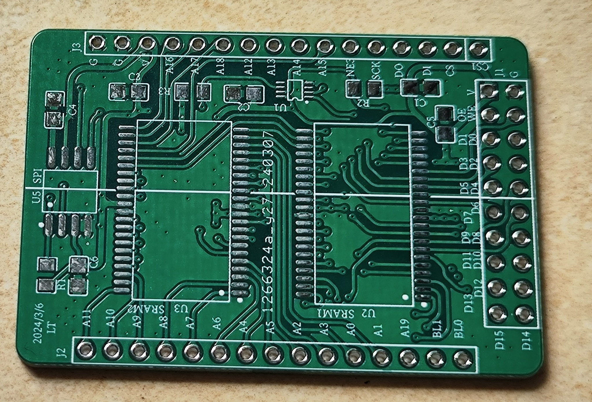 能力有限,PCB用了四层板。为了方便,地址线、高低八位数据线没有按顺序连接,没有影响连。通过飞线连接到主板的引脚。一开始使用的这种细小飞线,难焊还无法使用,最后换成大根的线。