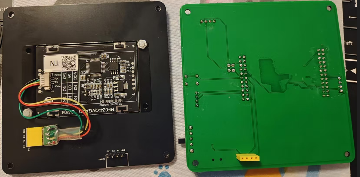 1、串口屏固定在屏幕支架的板子上,引出UART 4PIN接口,插到对应主板反面的4PIN接口上;