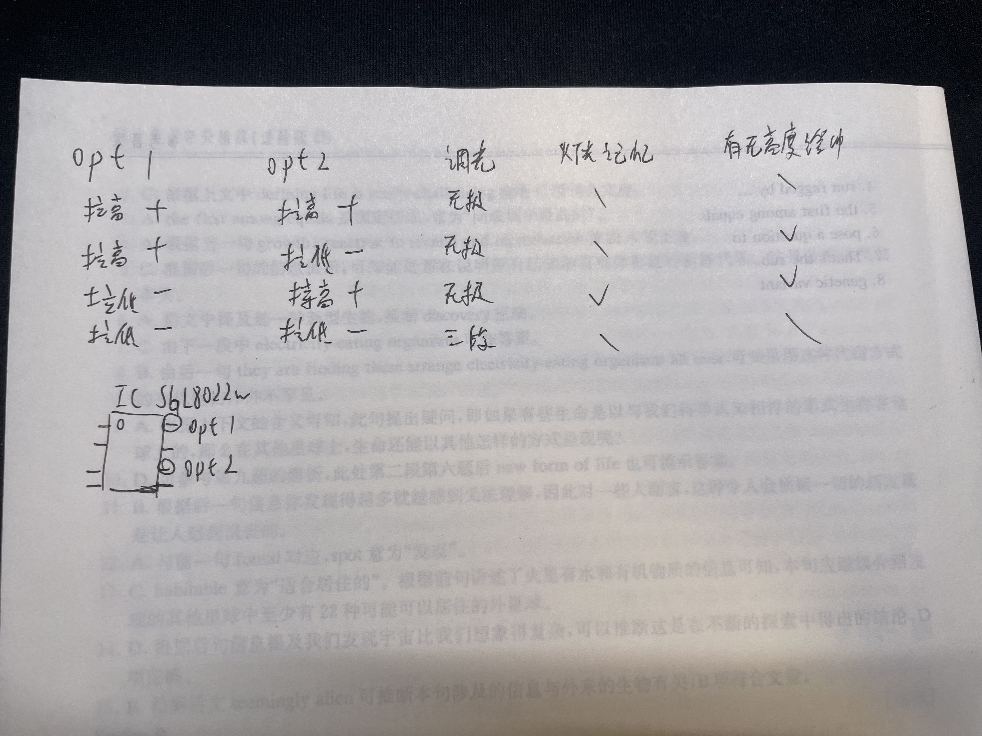 原理描述:通过对opt1和opt2两个引脚高电平与低电平的切换,实现对这个IC四种工作模式的切换。