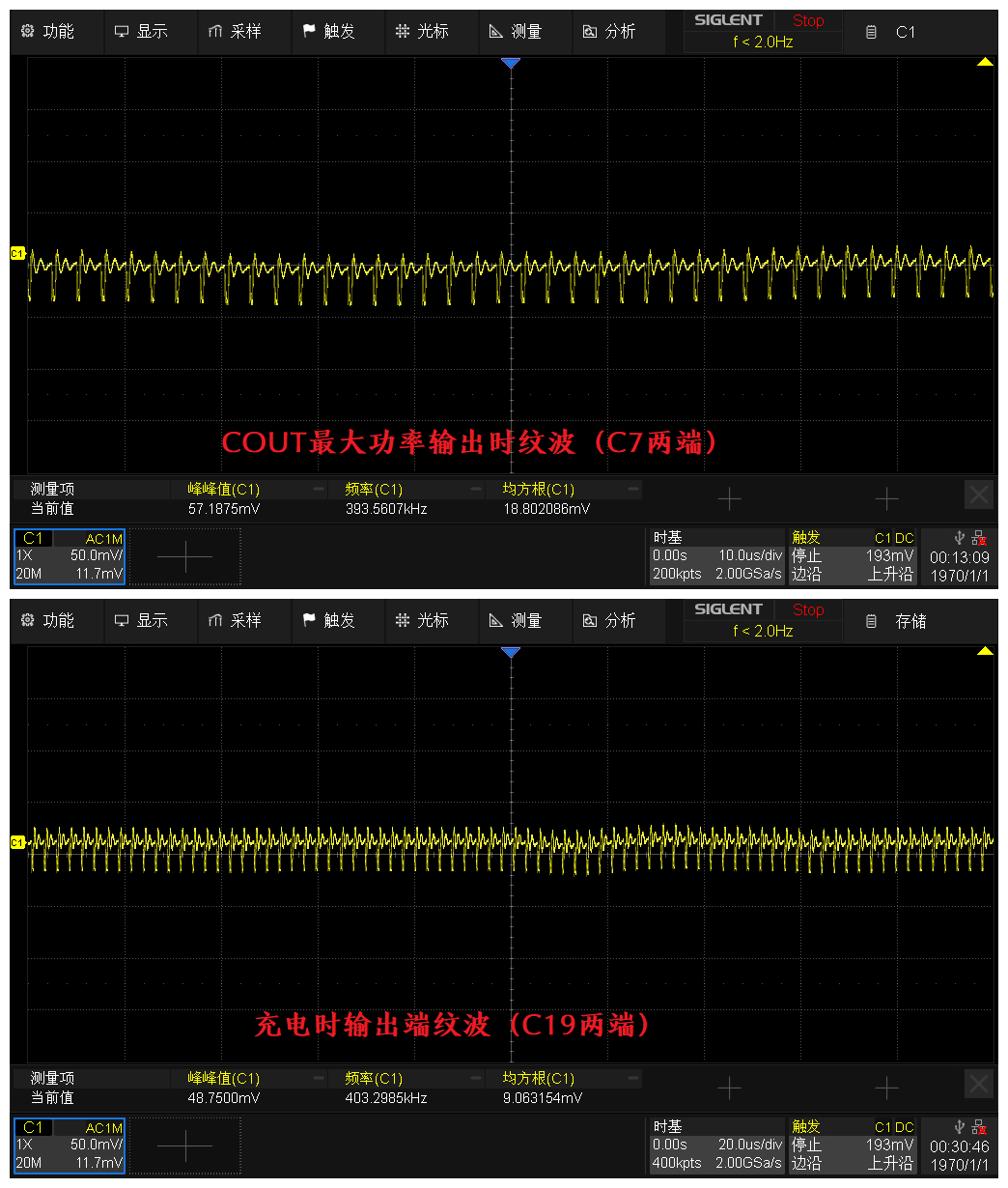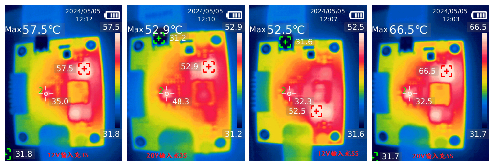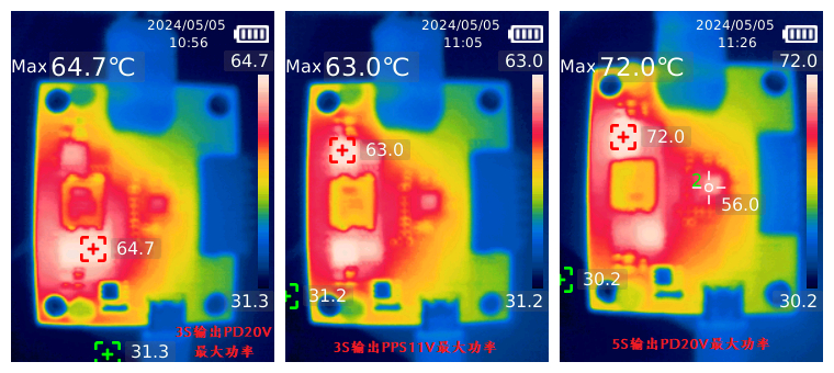 从温度图可以看出:PD20V充电时较PD12V充电时温度高,应加强散热措施(主动或被动散热),尽可能保证IC和MOS以较低温度运行,以提高稳定性;