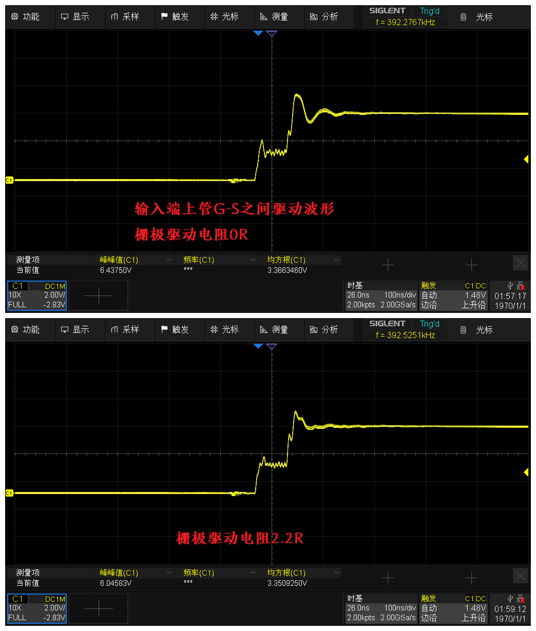 4、纹波良好,栅极驱动波形能看到明显的米勒平台,同时0R时振铃很小,搭配不同MOS时需要根据波形调整栅极驱动串联的电阻,同时有条件的话可以在该电阻两端并联快恢复二极管以加快MOS关闭时间,例如1N4148;