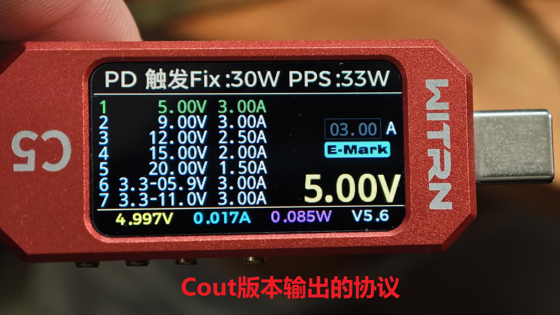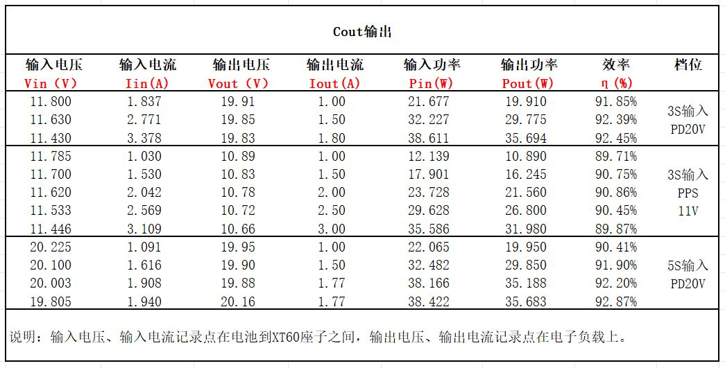 1、输出效率,平均都在90%以上。需要注意的是,Cout无输出时,接诱骗设备无法诱骗出电压,需要带着电压电流表先接手机激活一下Cout的输出,再用电压电流表诱骗出协议,猜测这个策略跟IC的烧录固件有关;