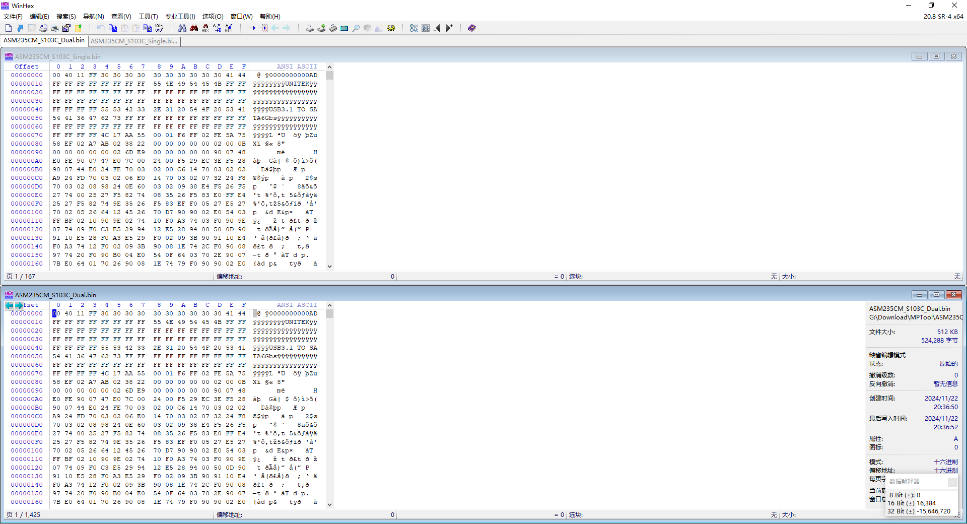 S103C原厂闪存镜像文件拿编程器提取了一个,放在附件内,有单双两个版本。原镜像是双分区固件,第一固件从0x00开始,0xEFDF结束,共61408字节。第二固件从0x40000开始,16进制内容和第一部分完全相同。单分区的是后期拿WinHEX自己改的。