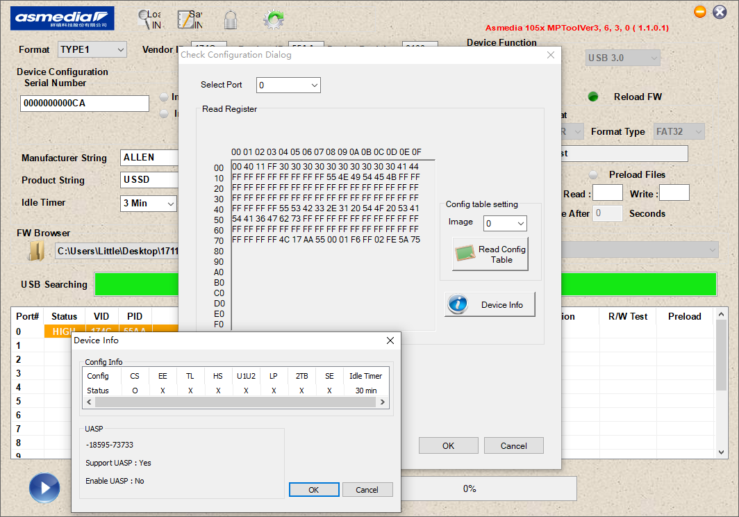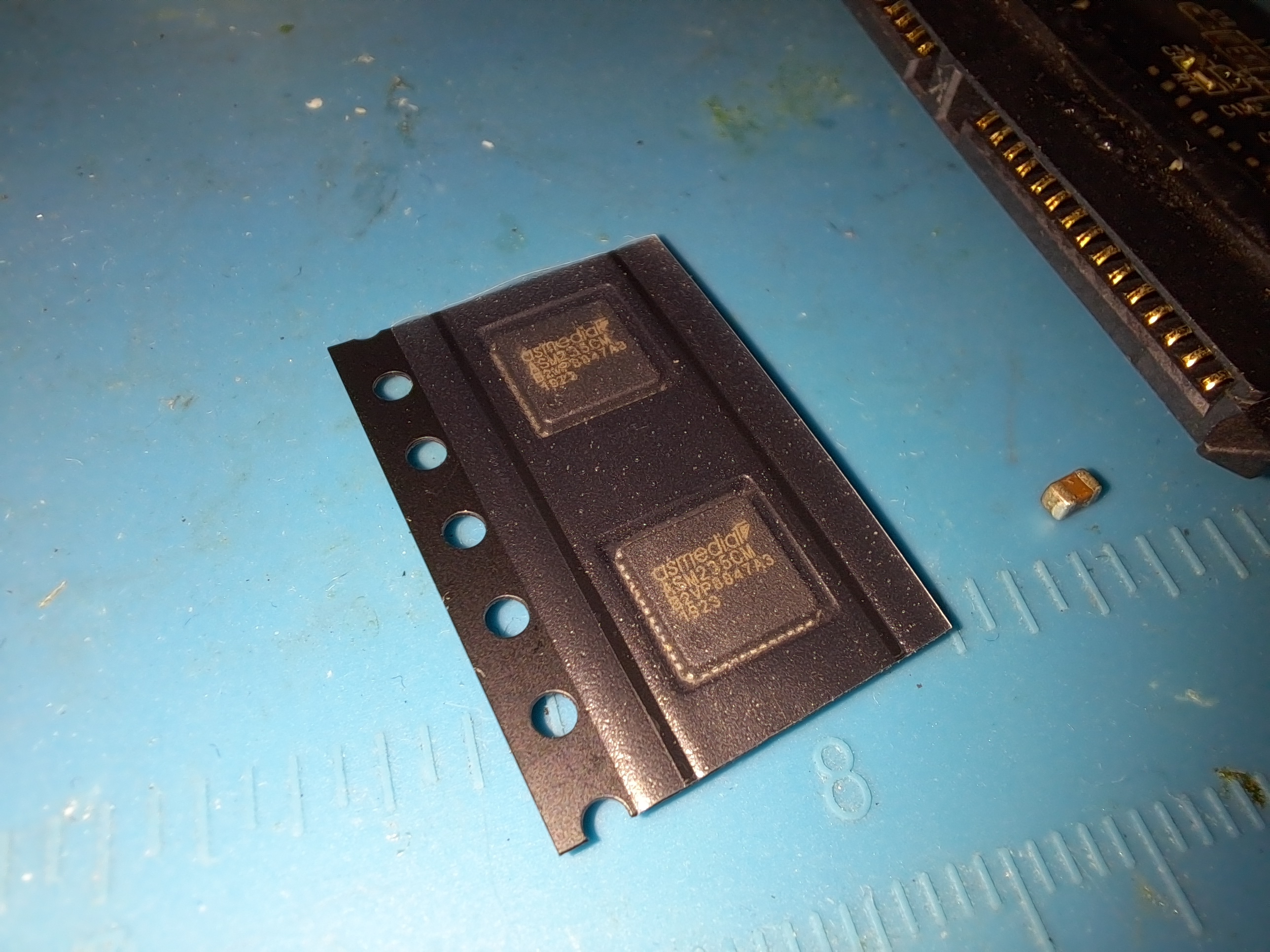关于固件。如网上所说,这芯片不刷固件也能正常用,不过从外置Flash加载固件后,能支持休眠功能、trim协议、显示设备名称等高级功能。ASM235CM的内置LDO输出是2.5V电平,SPI可以用兼容2.3V-3.6V宽电压的型号。手上有FM25Q04B和P25Q40SH,容量512KB,实测工作正常。