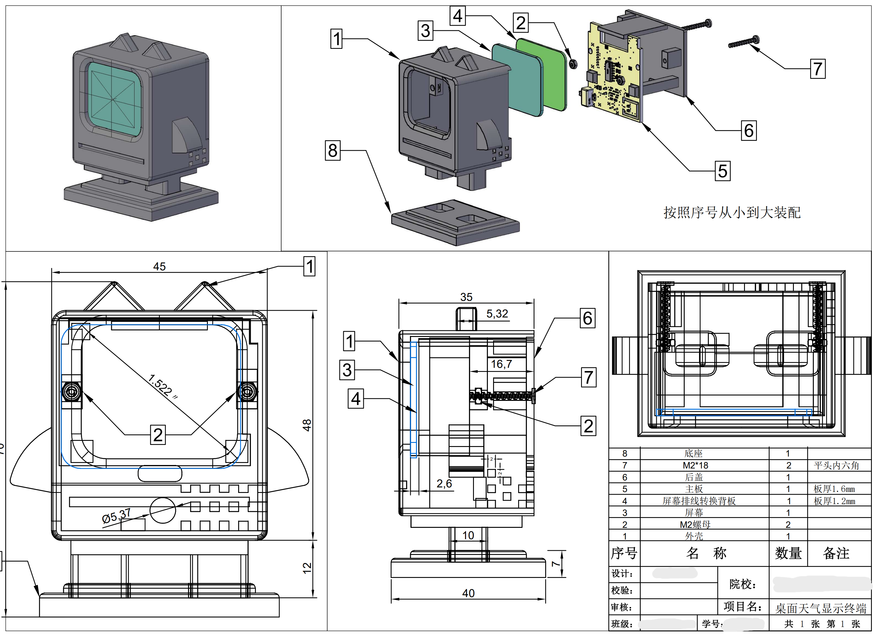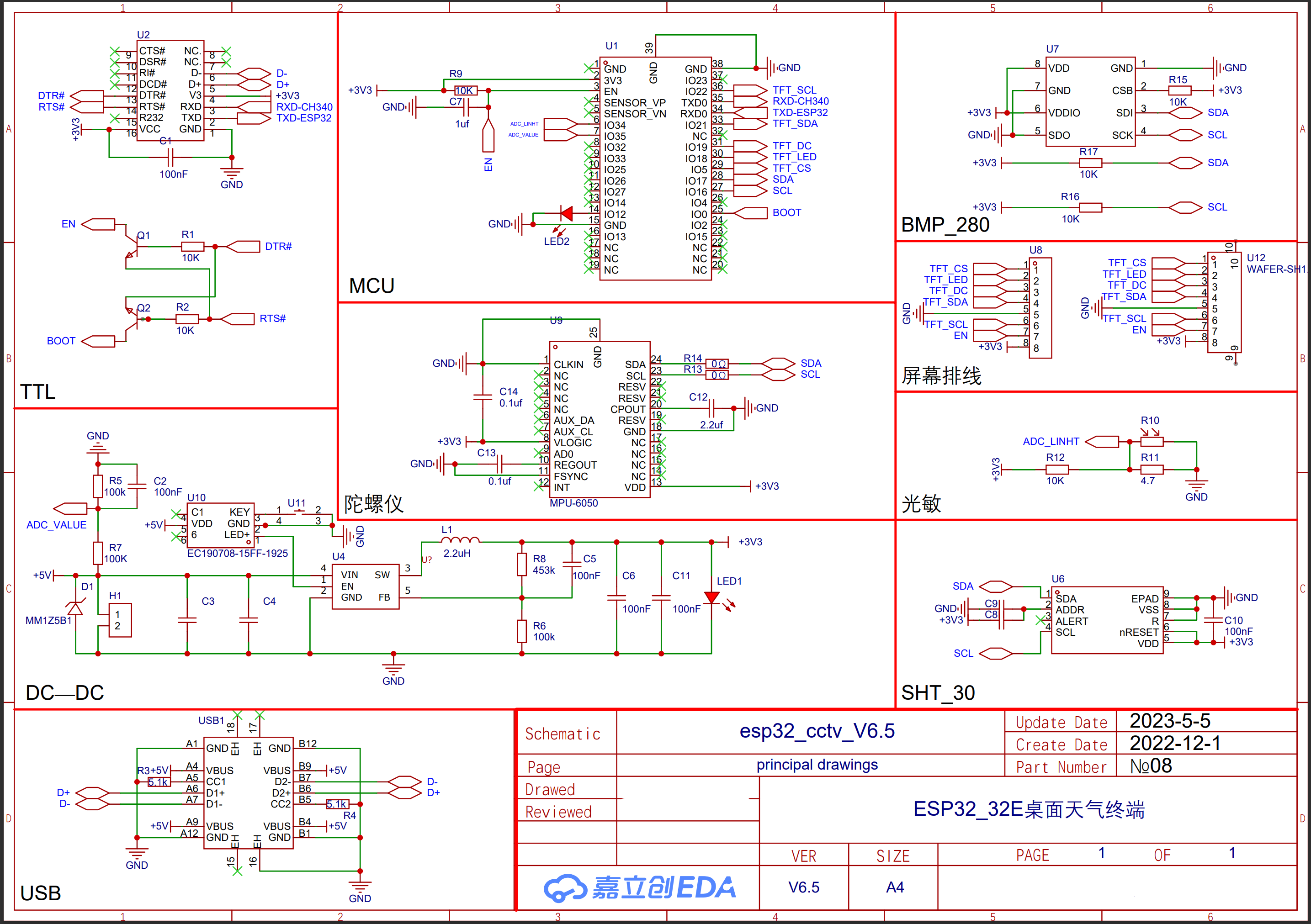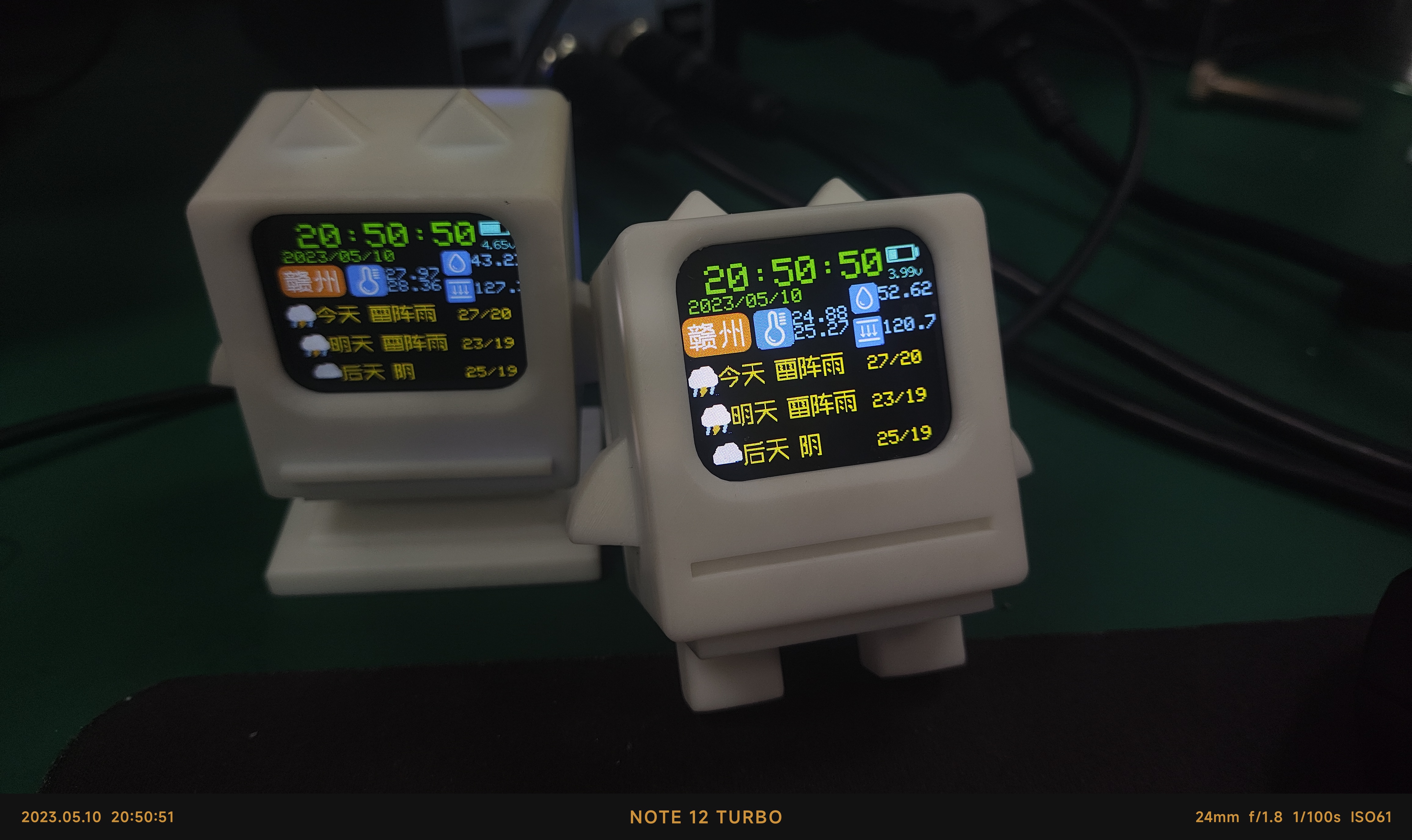 使用ESP32-WROOM系列国产WiFi芯片为主控芯片,本地传感器采用sht30和bmp280两个温湿度气压传感器实时检测并显示本地气温数据,主控联网通过ip自动获取所在位置和天气情况。内置的感光原件可以通过判断环境光强度自动调节屏幕亮度,并具有OTA远程固件升级功能