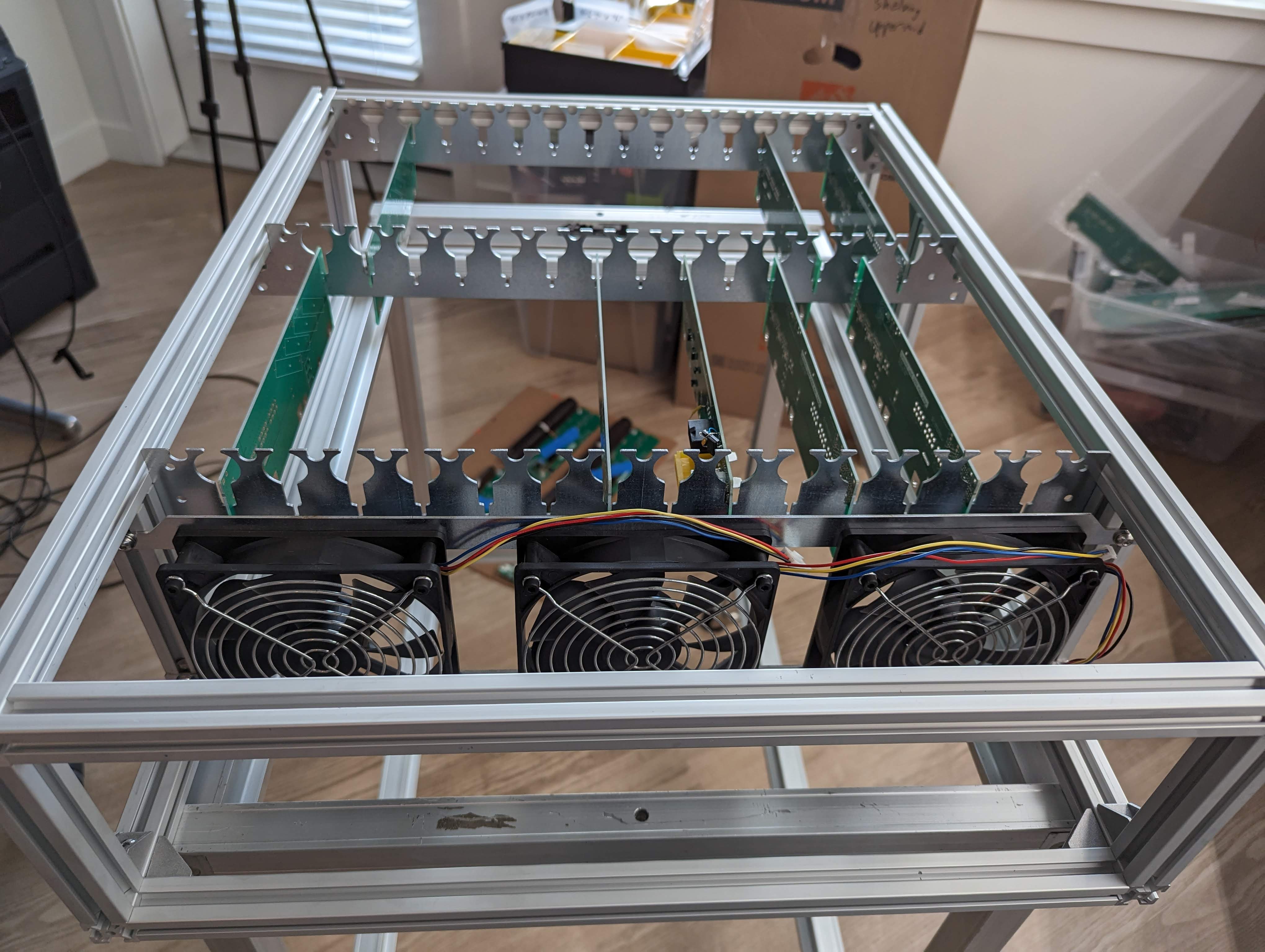 底盘设计为像其他所有东西一样扩展,由用螺栓固定在一起的多个级别组成。每层支持13个负载级和三个120mm风扇。负载阶段通过使用 PCB 中的钩子安装,这些钩子插入金属板横梁。横梁还充当电缆导管,最终将包括3D打印的插入夹,以保护电缆并将负载级保留在其插槽中。