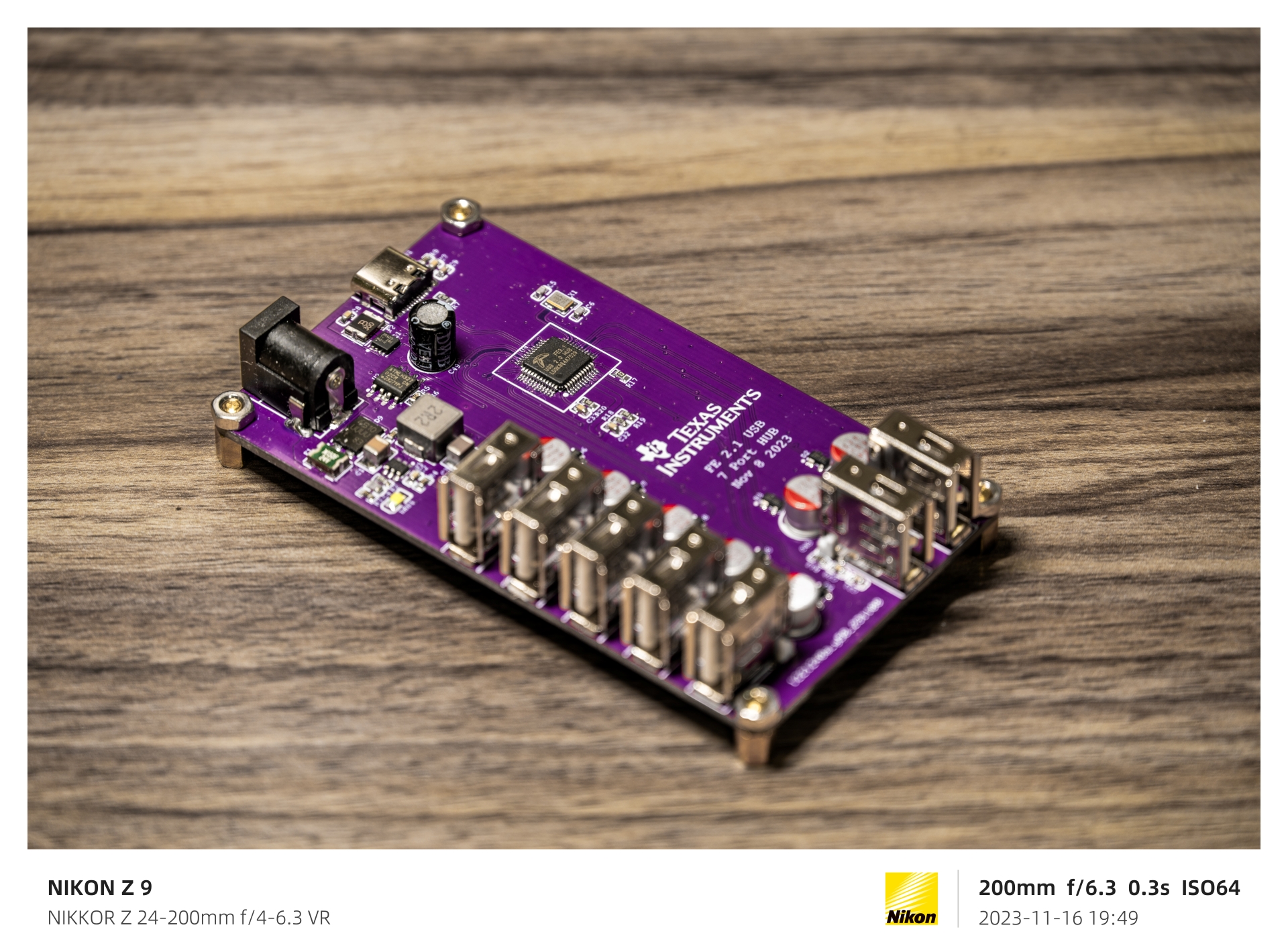 这个扩展坞采用USB-C接口输入,CC全部配置为Rd下行模式。这就意味着使用含有CC线芯的USB CtoC线缆可以连接含有D+和D-数据线的任意USB主机(包括MacBook)。注意,苹果iPad等原装的1米CtoC线只有CC线芯,没有USB2.0的D+和D-线芯,所以无法使用,只能用来充电。1.8米的那款是可以用的。这个扩展坞还装备了一个DC输入接口,输入范围4.5V-17V,能输出峰值5A的5V Bus电压给7个端口上的设备同时供电,防止C口的负载过大。C口附近设计了防反灌、防反接和尖峰吸收电路,所有USB电路也配备了TVS二极管,电源芯片附近也放置了自恢复保险丝,防止意外情况的发生。一颗电源指示灯在有效连接后便会亮起,指示扩展坞工作正常。7个下行端口采用USB-A接口,拥有最强的适用性。