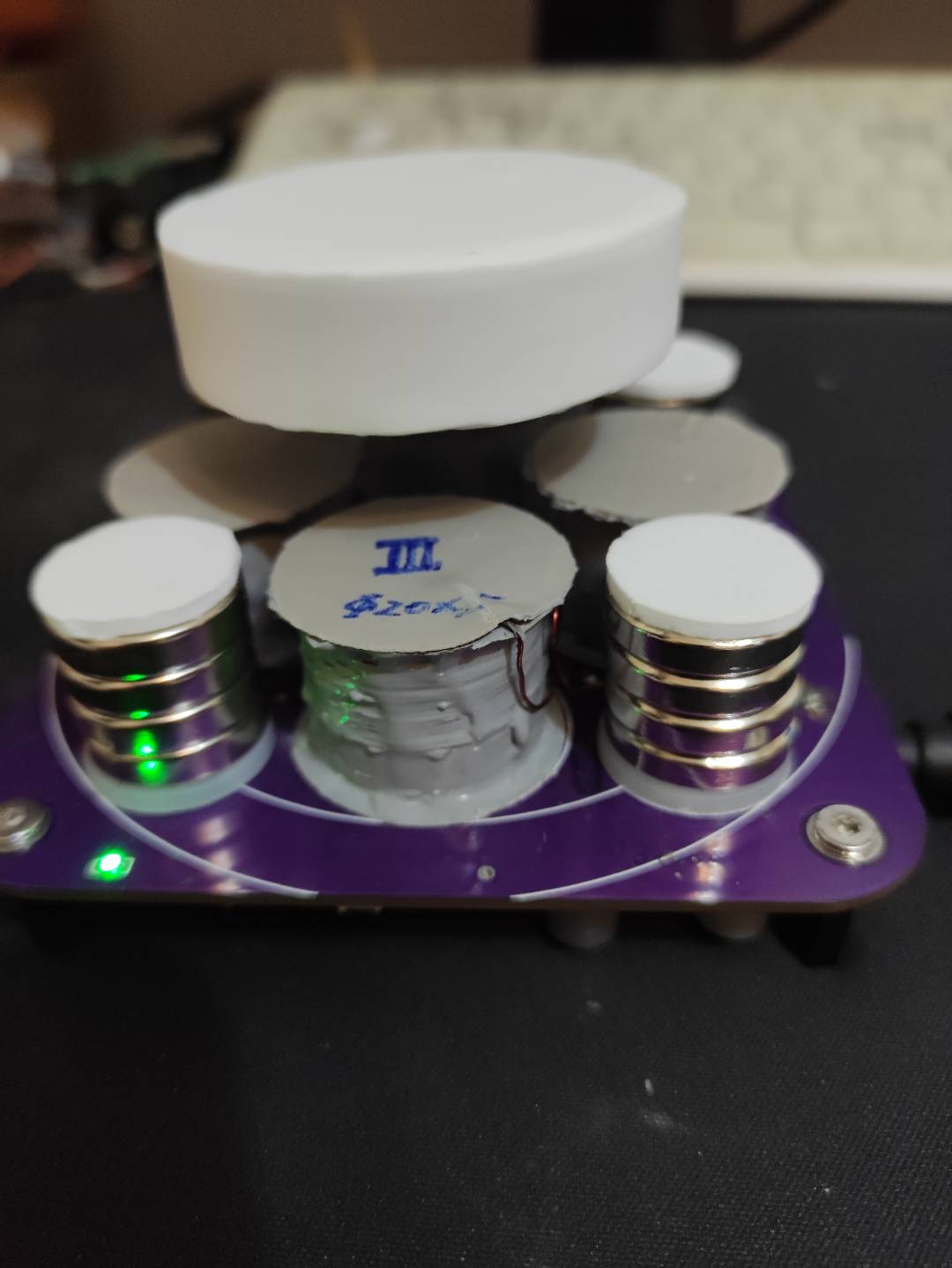 放上悬浮磁铁,轻轻拨动悬浮磁铁位置,看电流减小的方向,然后拨动相关XY位置霍尔,在放上悬浮磁铁。