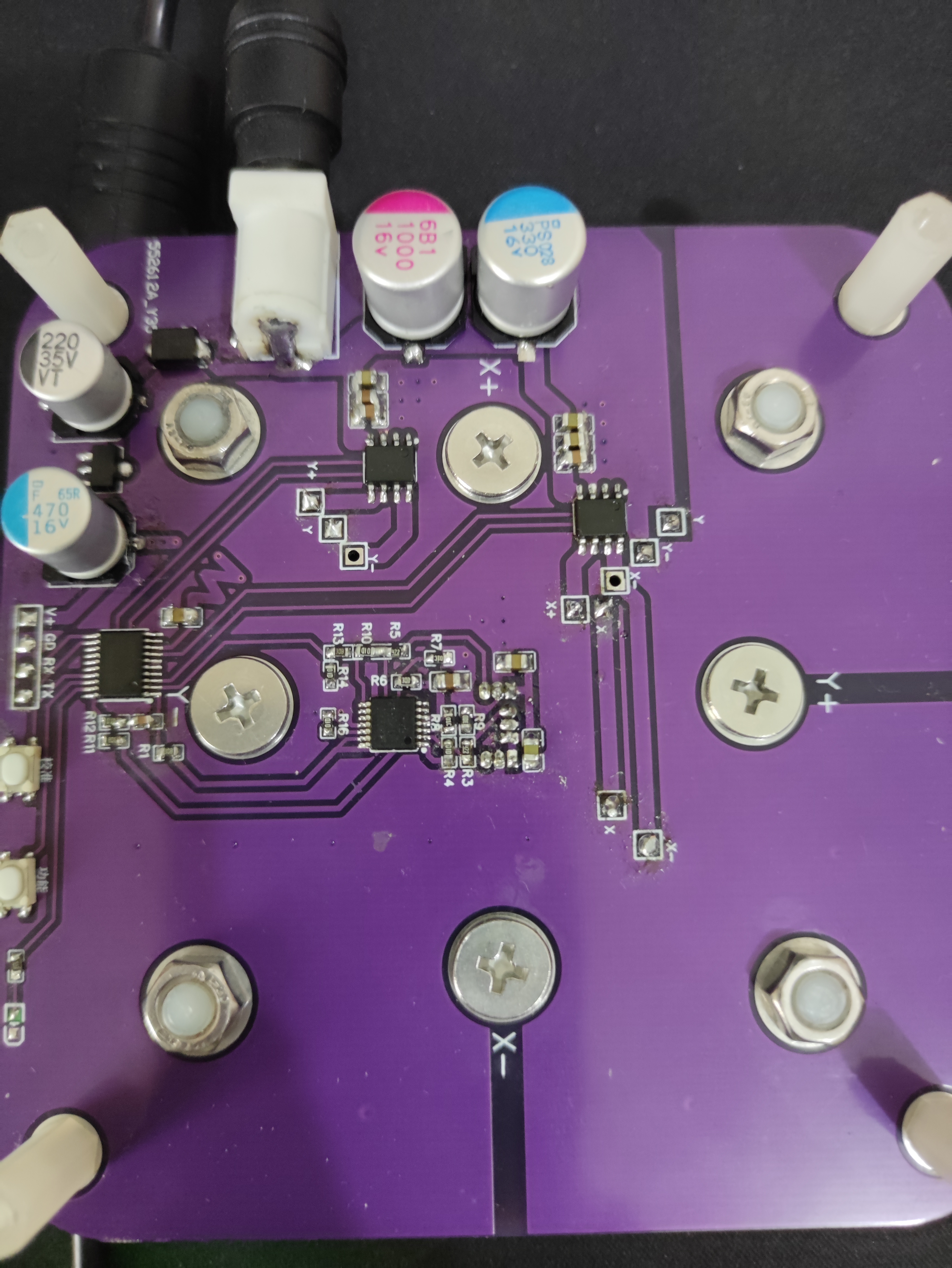 焊好霍尔测试输出是否在2.5V左右,可以调节R6 7 8 9到2.5V左右,如果不管在1.5-3.5V左右应该也可以,最后按键软件可以校准。