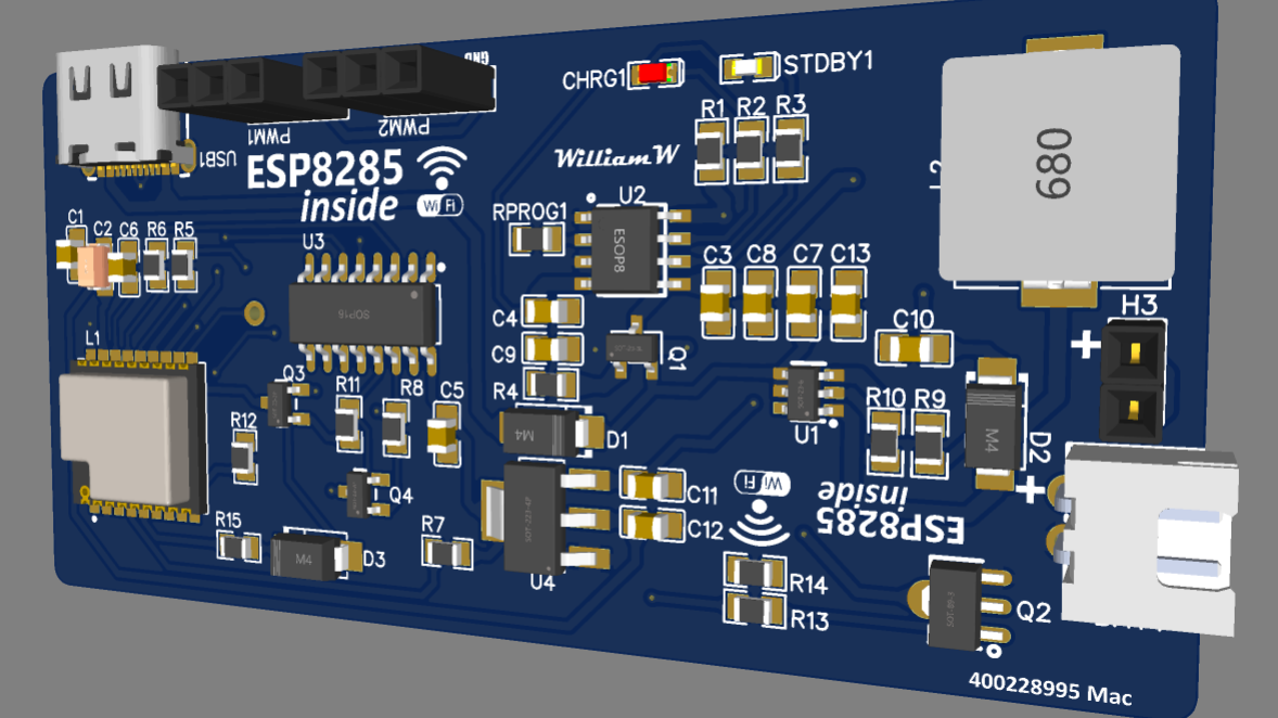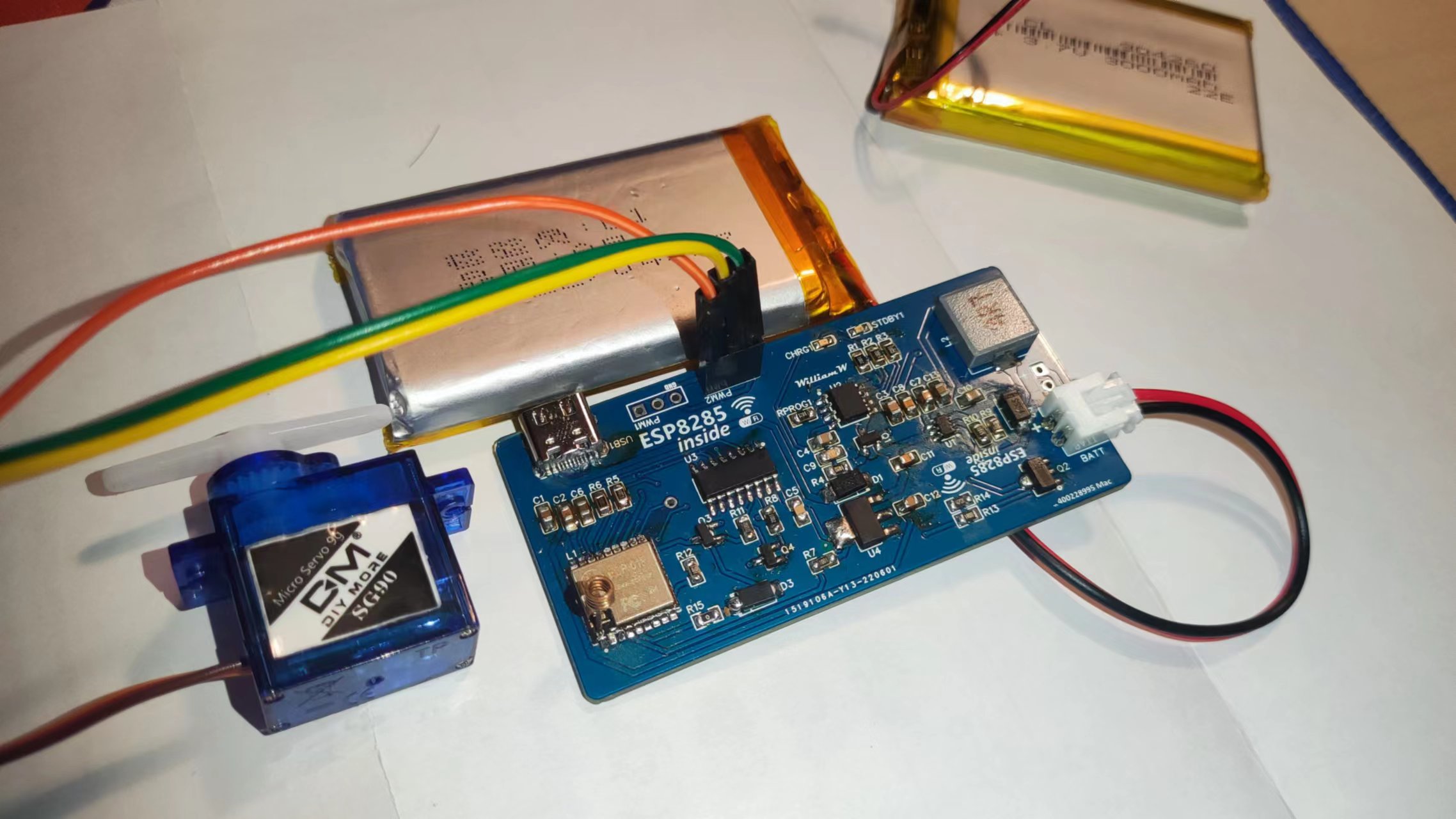 基于乐鑫ESP8285的ESP-01F模块,并使用深度睡眠功能; 可驱动两台舵机; wifi和热点控制(基于arduino的http client); TP4056锂电池充电管理,可自动切换电源;