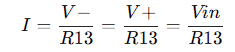 单独对R13来看,流过的电流也等于它两端的电压除以它的电阻值,代入Vin=V+=V-得到以下公式: