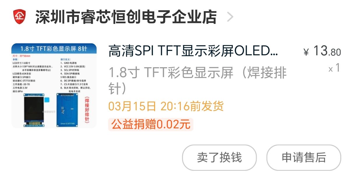 1.8 TFT 是一款彩色显示屏,具有 128 x 160 个彩色像素,使用四线SPI通信方式与单片机进行连接。