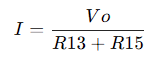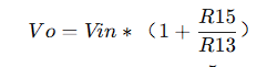 假设运放反向输入端接地,构成正相比例放大电路,由运放的虚断特性可知运算放大器两个输入引脚流过的电流为0,即流过R4的电流为0,Vin=V+。可以看做R13和R15串联,所以流过的电流也相同。由虚短特性可知两个输入引脚的电压相同,即V+=V-,所以有Vin=V+=V-。Vo与R13和R15构成回路,则流过的电流为: