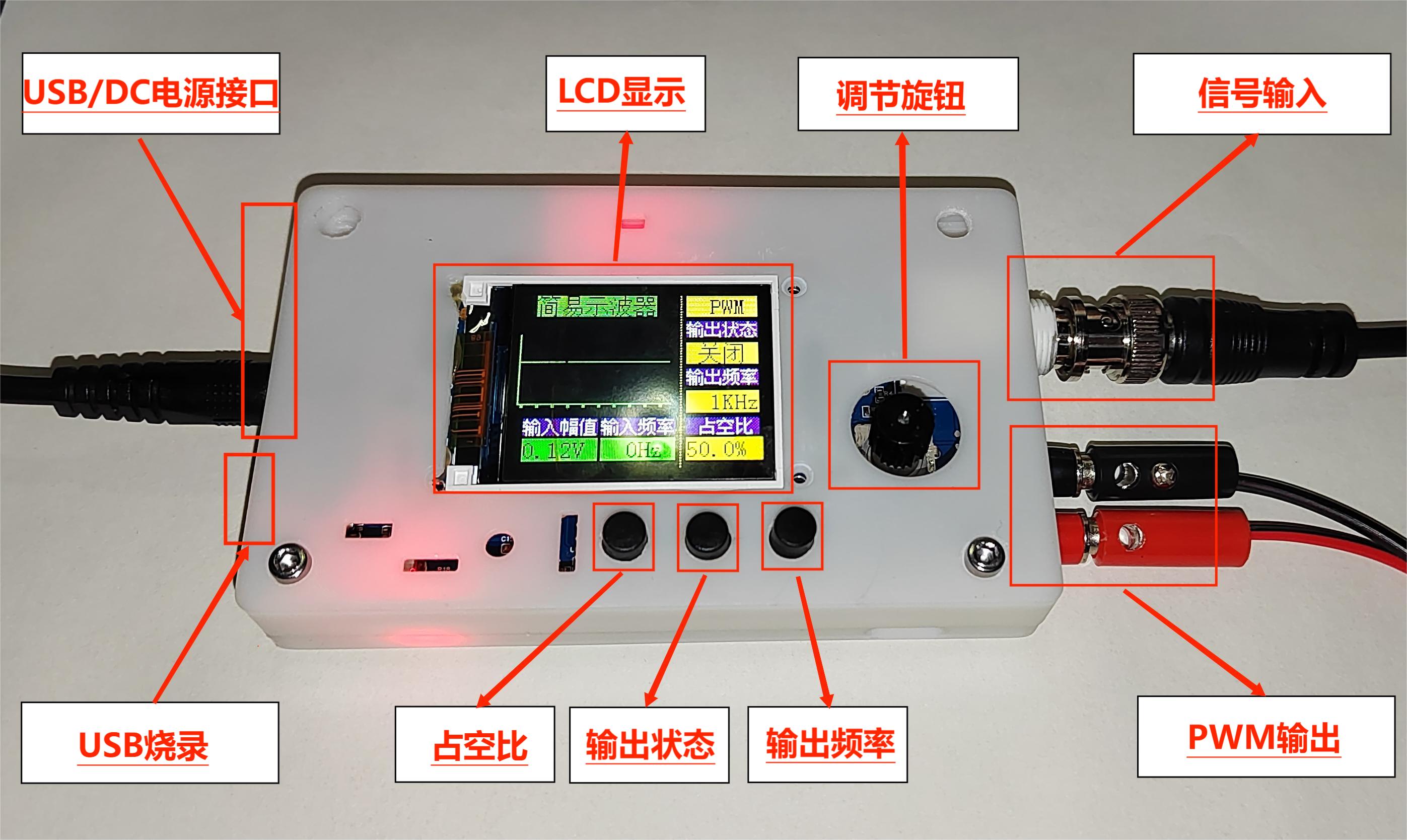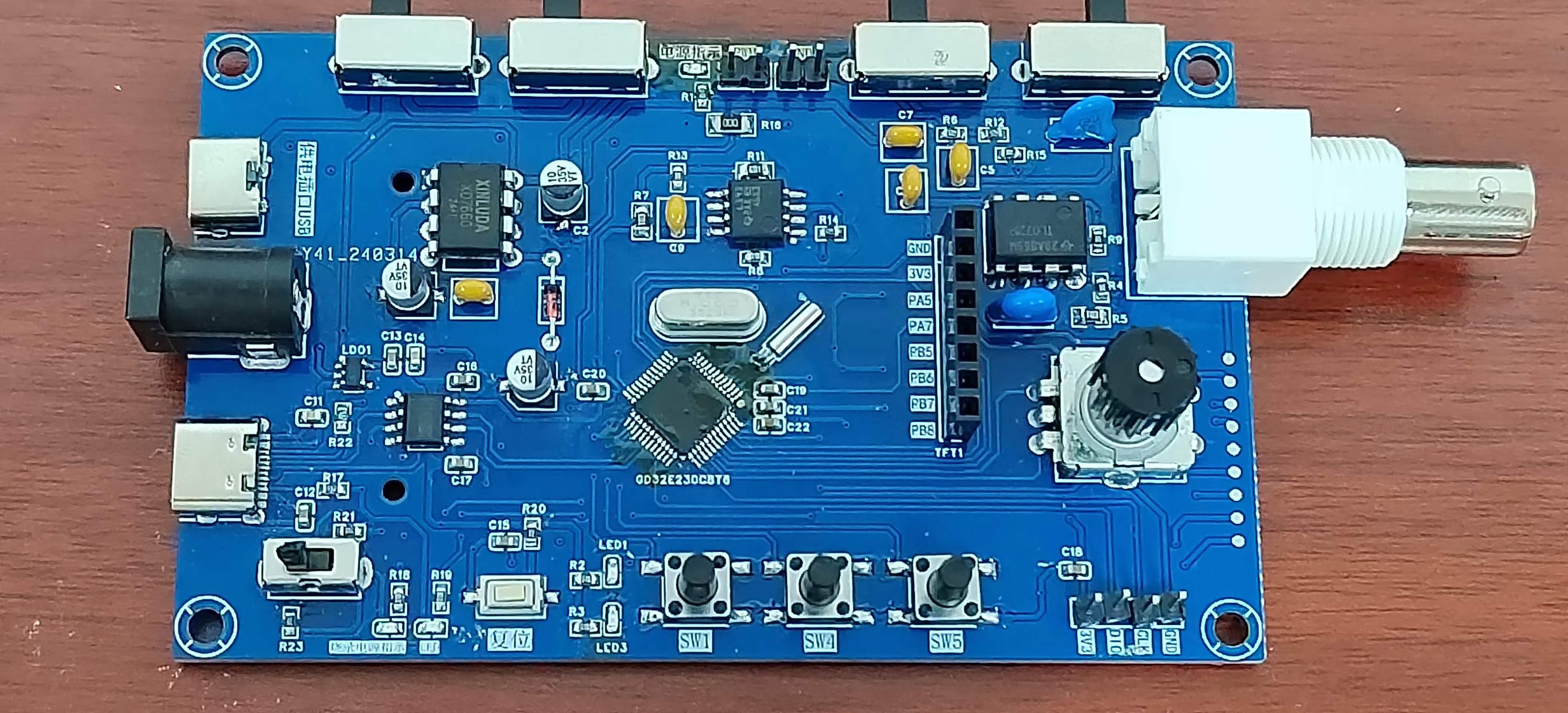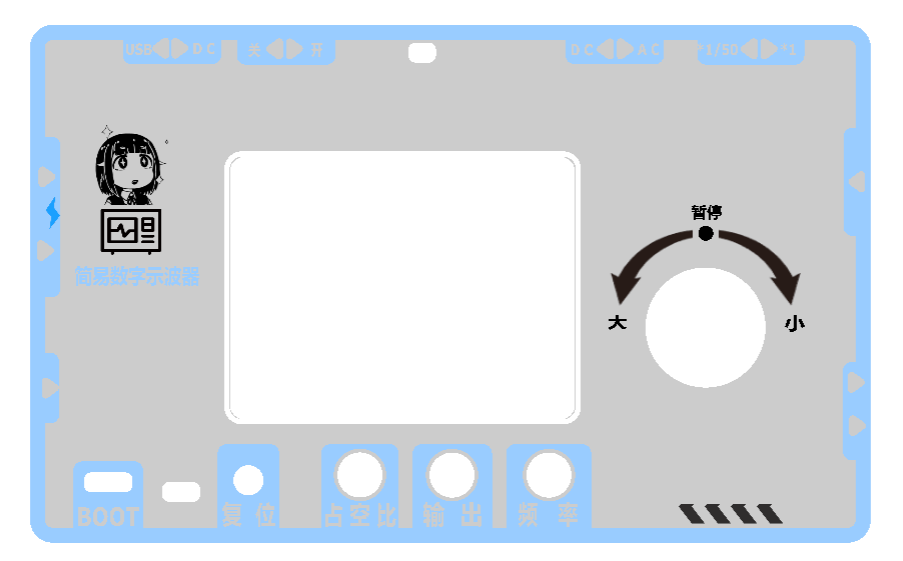 我将BOOT切换方式换为开关,调整BOOT开关,通过usb线连接烧录type-c口烧写程序(也可使用stlink等方式),调整BOOT开关,按下复位按键,可以正常显示,也可以正常测量波形;然后的问题就是PWM输出开关按键按下之后和频率调节按键功能一致。