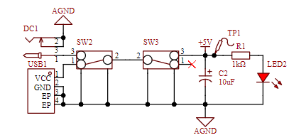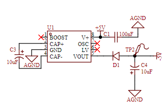 除了电源输入电路为,为保障运算放大器对于负电压的测量性能,使用了XD7660负压产生电路得到一个 负电压,该芯片外围电路简单,只需要两个电容和一个二极管即可工作,理论上输入电压为+5V,也可以输出一个-5V的电压,由于芯片内部存在一定压降及转换效率,实际测量负电压为-4.3V左右,也能满足运算放大器的要求。