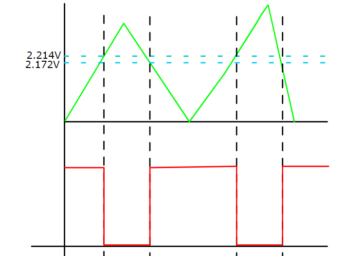 下图绿色线代表信号输入电压变化情况,从0电位上升,初始输出状态为高电平,输入电压达到2.214V时,输出信号变成低电平,直到输入信号低于下限阈值2.172V时输出变为高电平。可以根据比较器当前的输出状态来确定下一个变化电平的阈值,当输出为高电平时使用的是高阈值Uth,输出为低电平时使用低阈值Ttl。之所以将阈值设置接近是为了避免信号干扰造成的误识别。