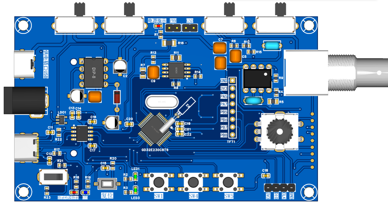 简介:使用GD32E230C8T6实现简易示波器,支持波形和频率测量以及PWM输出。开源协议