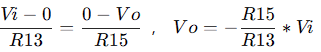假设运放正向输入端接地,构成反相比例放大电路,由运放的虚断特性可知反向输入引脚流入运放的电流为0,可以R13和R15可以看做串联,所以流经电流相同。由虚短特性可知V+=V-=0,由此可得: