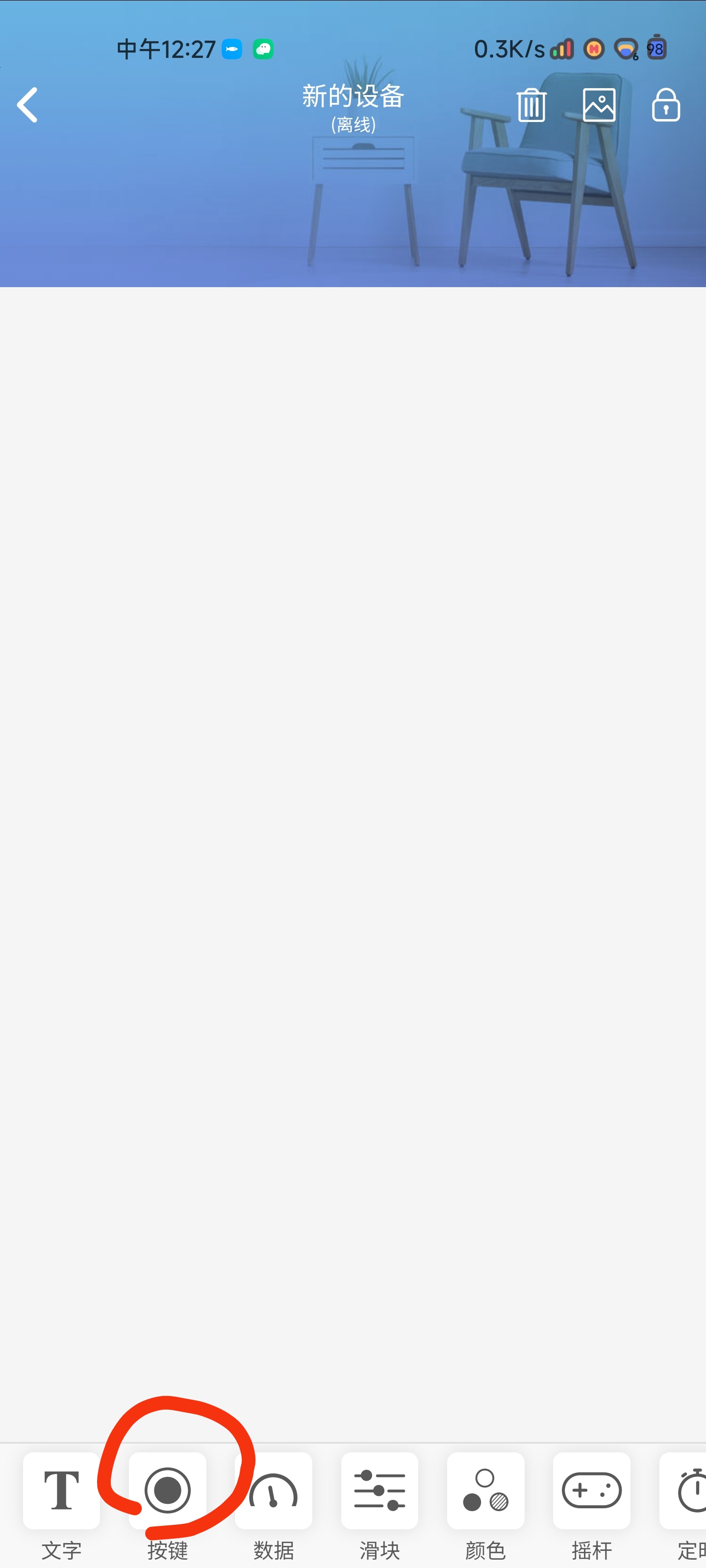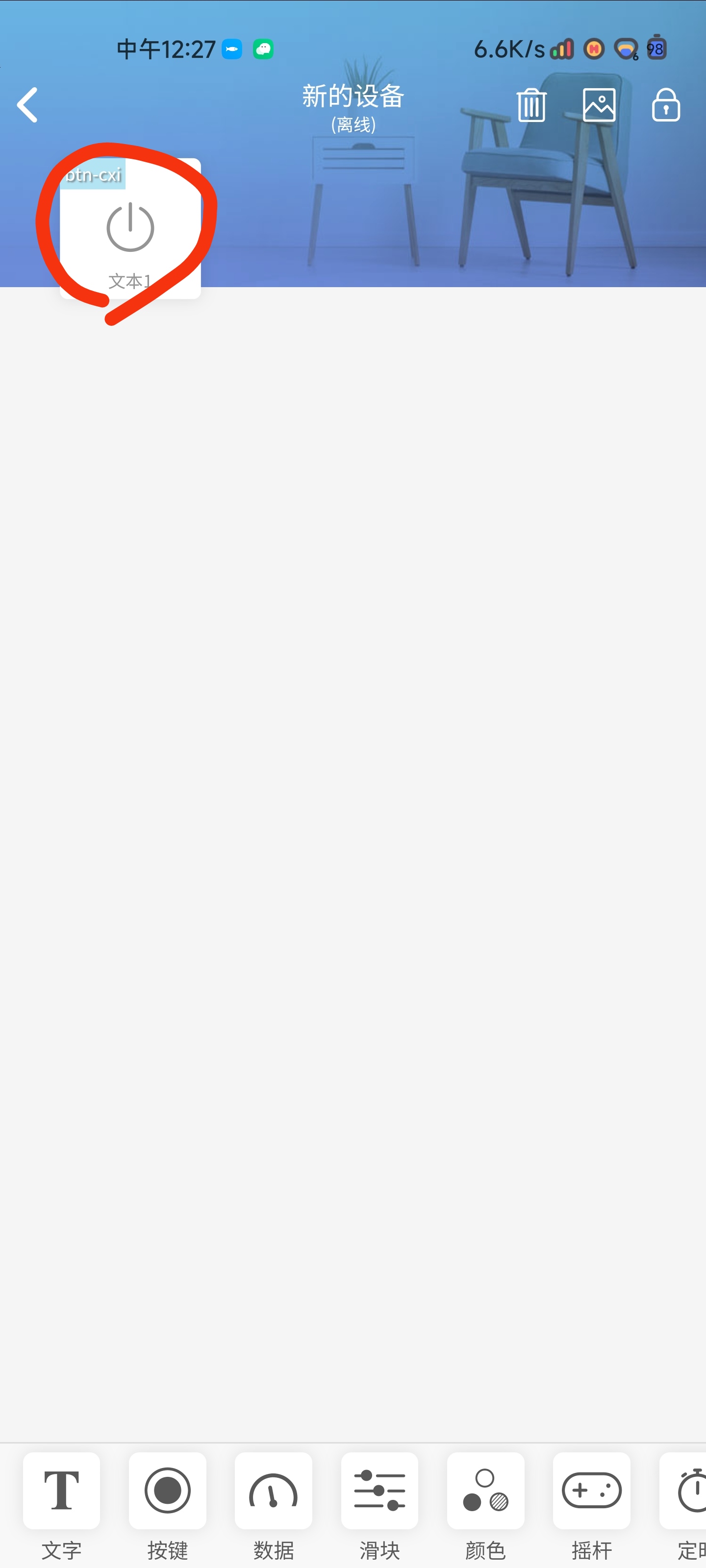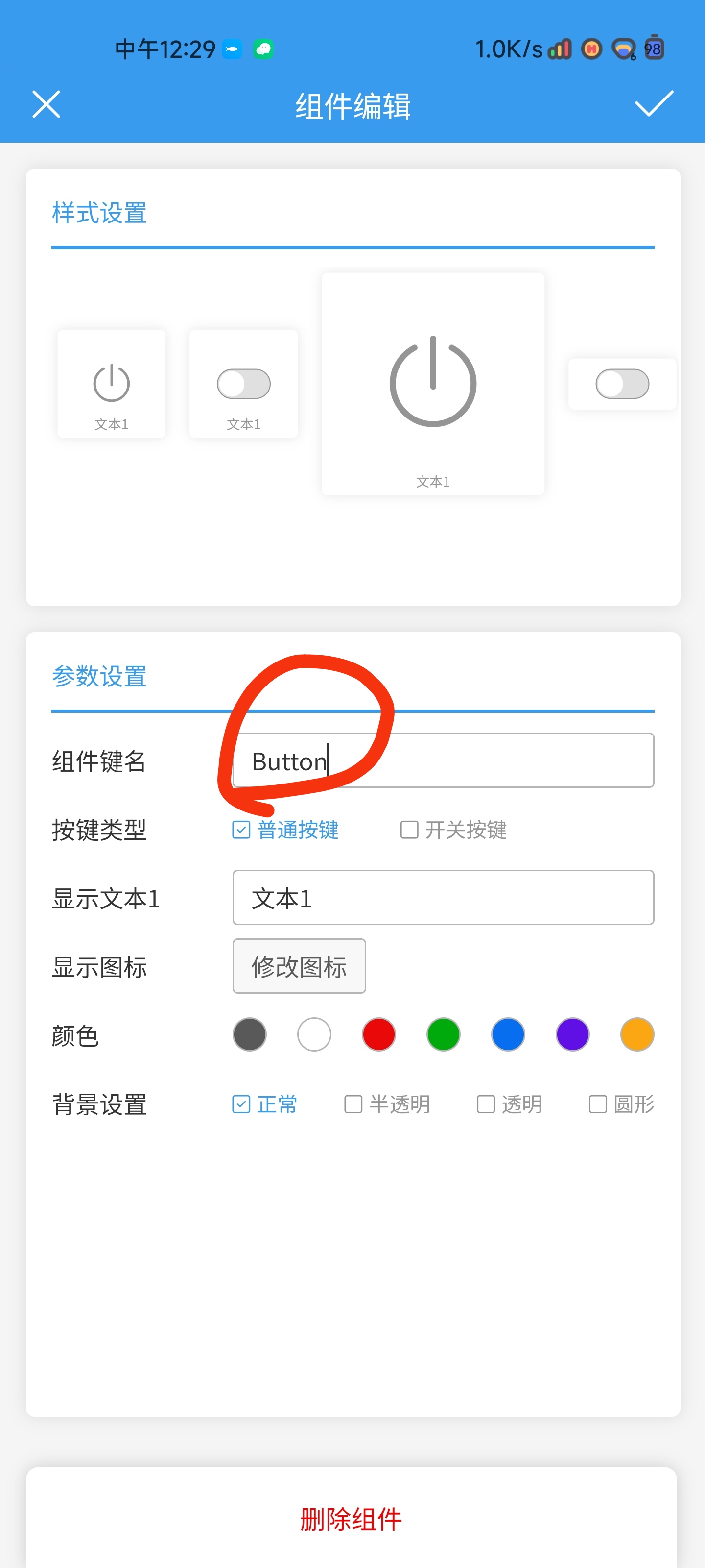 3 退回主界面点击新的设备 一定要把组件健名改为Button