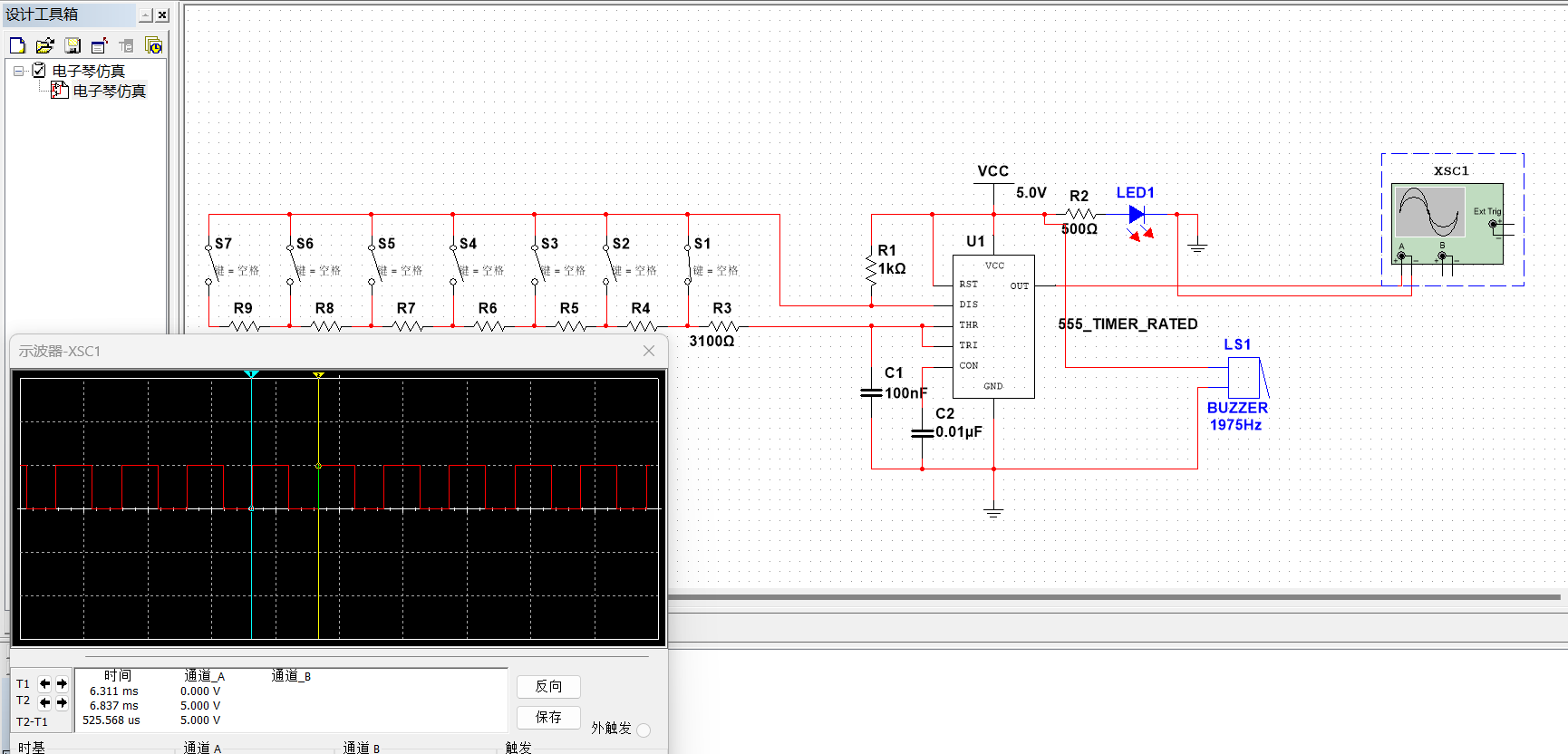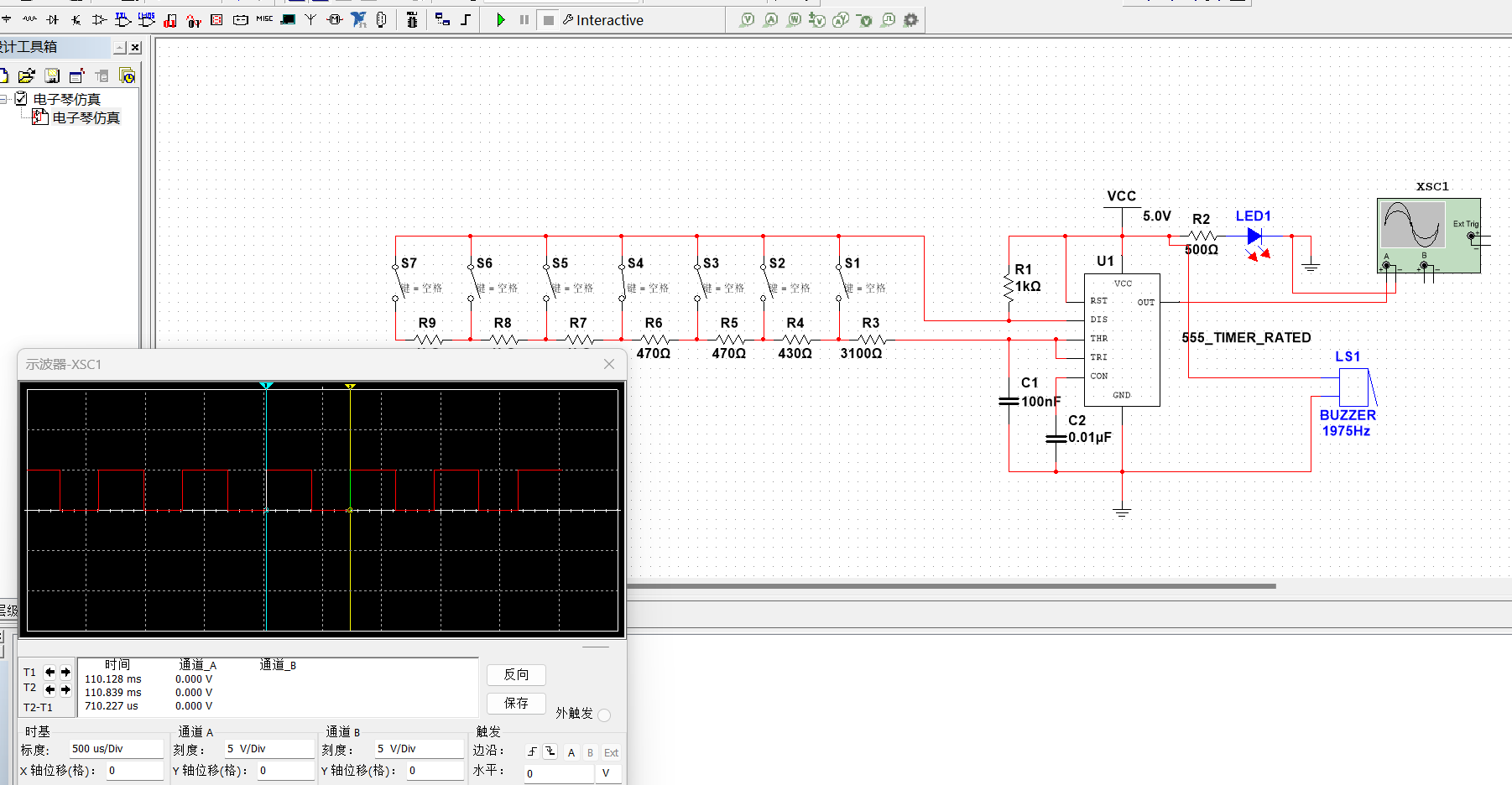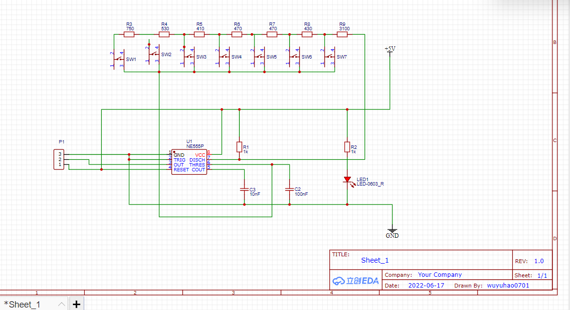 原理(工程文件见附件): 根据外接电阻阻值的不同,555定时器的3号管脚(OUT)可以输出不同频率的方波。而无源蜂鸣器发出的声音与输入的频率有关。基于这个原理,可以用多电阻串联的方式,加上开关。按下不同的开关,555定时器会输出相应音符的声音频率,通过蜂鸣器实现七个基本音符的发声,实现555定时器简易电子琴的制作。
