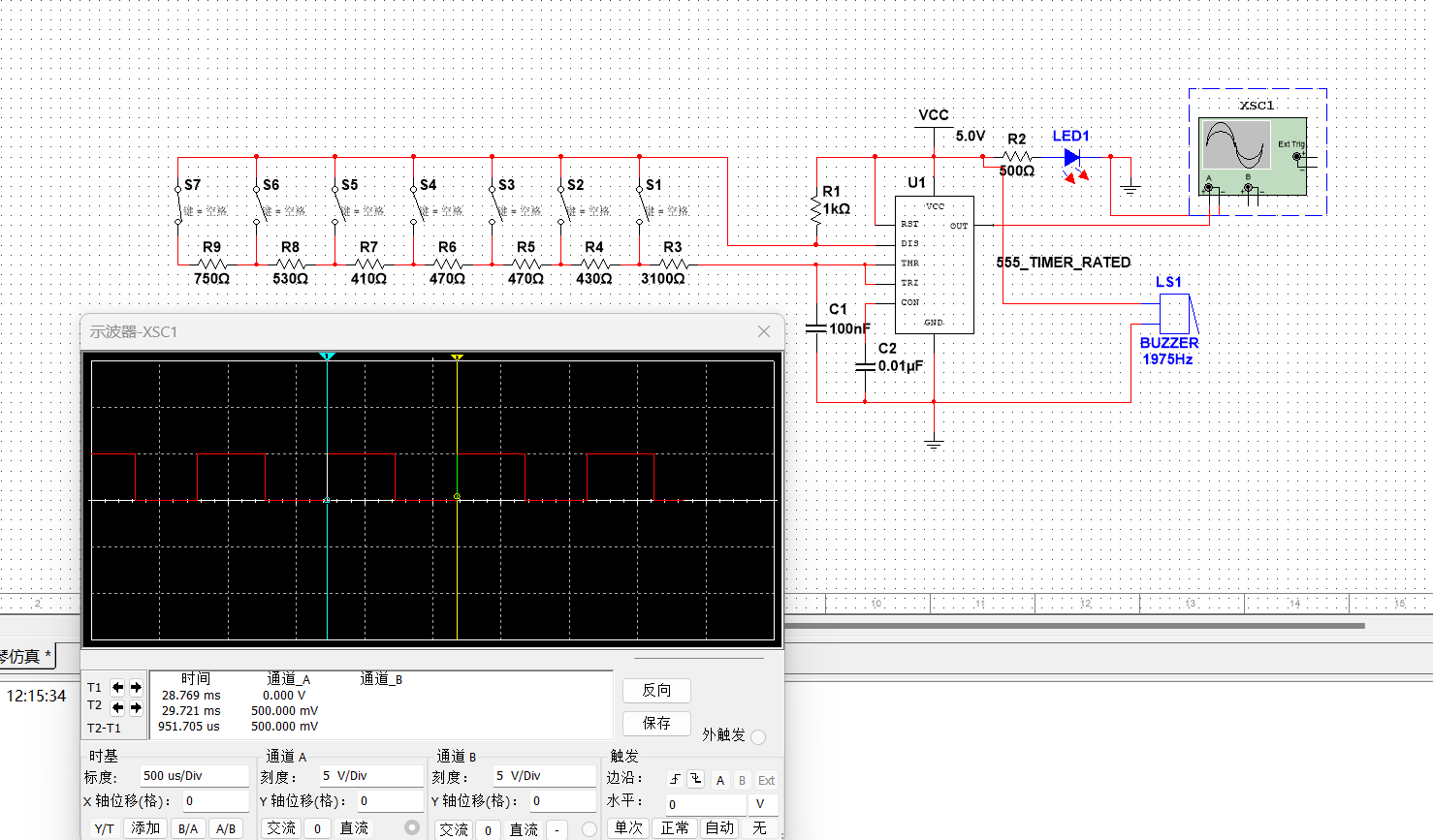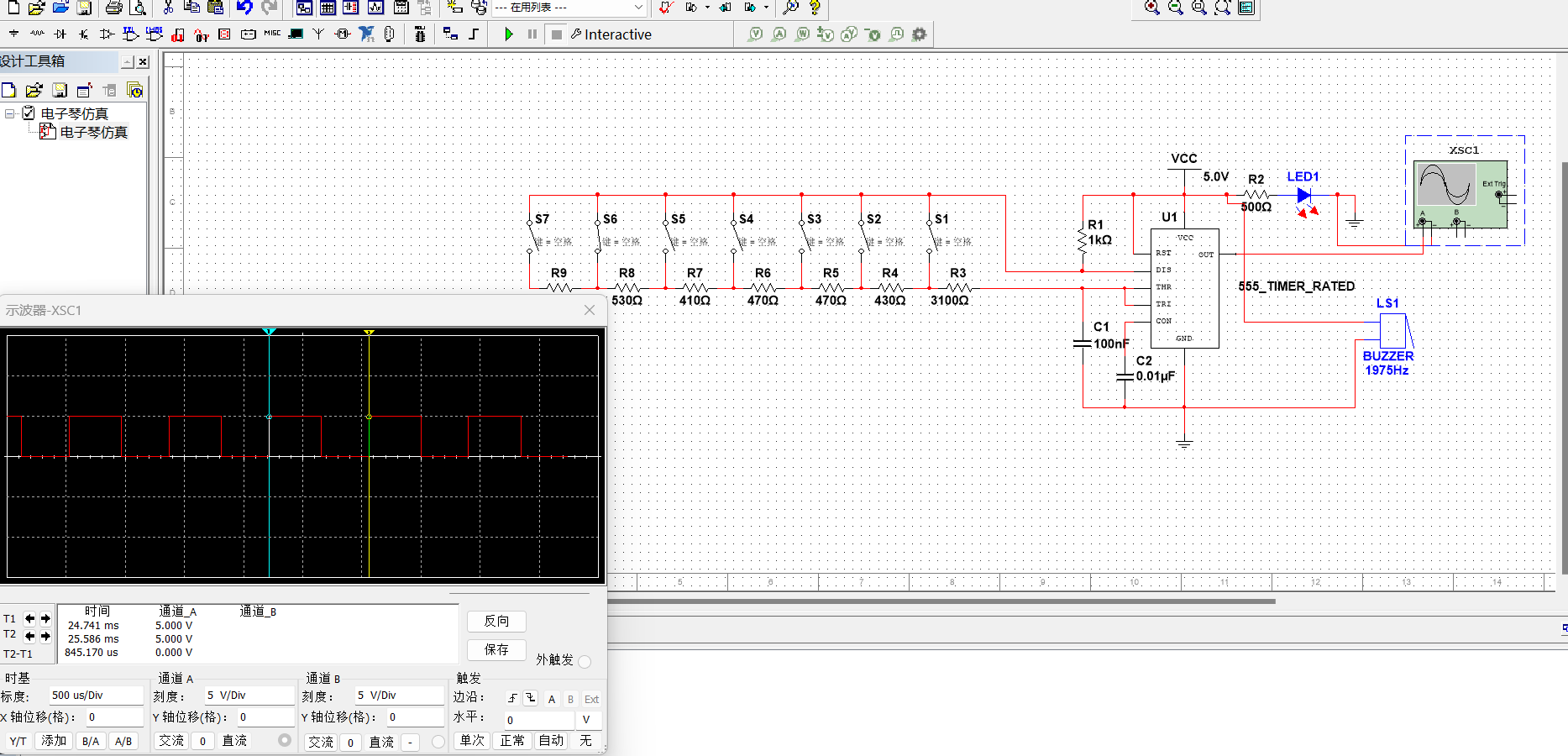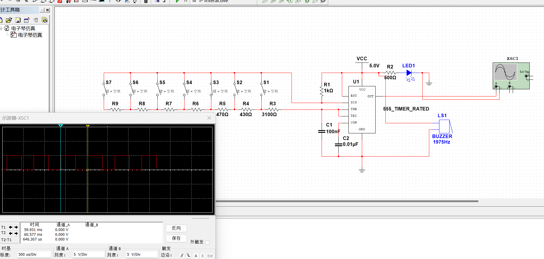 原理(工程文件见附件): 根据外接电阻阻值的不同,555定时器的3号管脚(OUT)可以输出不同频率的方波。而无源蜂鸣器发出的声音与输入的频率有关。基于这个原理,可以用多电阻串联的方式,加上开关。按下不同的开关,555定时器会输出相应音符的声音频率,通过蜂鸣器实现七个基本音符的发声,实现555定时器简易电子琴的制作。