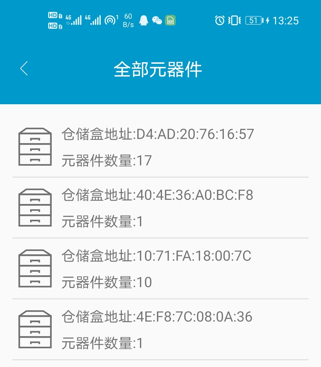 在这个功能里面,可以查看到全部的电子元器件智能存储盒,包括之前使用过的都可以查看到。