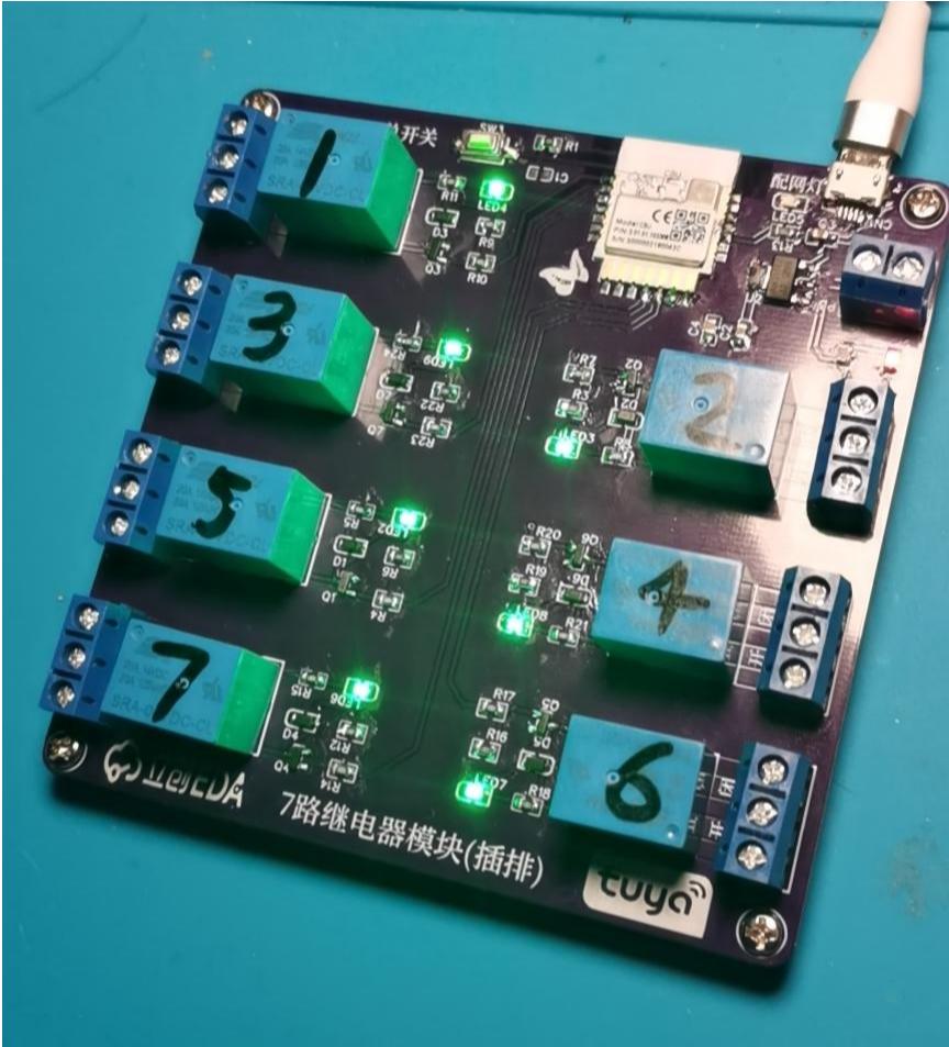基于涂鸦智能cbu模块的7路手机控制继电器(插排)模块,免程序开发,继电器隔离输出。可手机设置定时,倒计时,循环定时等功能。