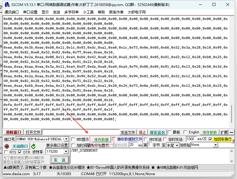 - 使用SSCOM或其他支持保存文件的串口工具,设置好波特率之后发送截屏控制台指令"/DEV_SCREENSHOT",设备会返回ASCII格式的XBM图片数据。