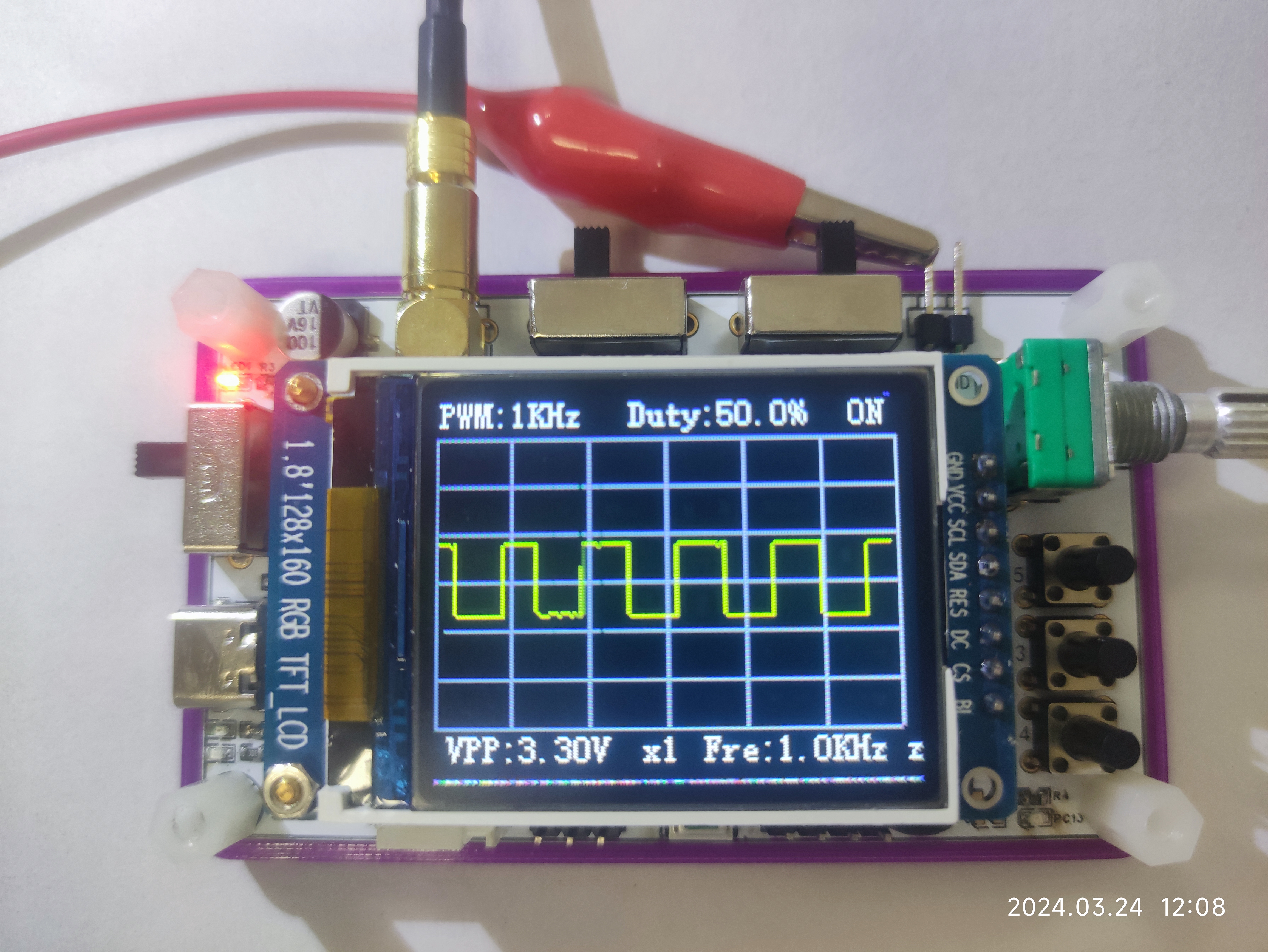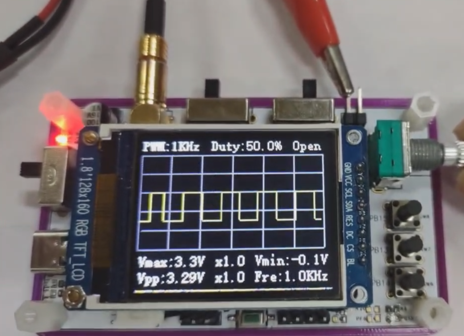 2,整体部分包括:PCB板+1.8寸屏幕+锂电池+示波器探头。