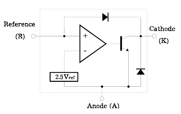 下图为431的等效功能示意图,由运算放大器、保护二极管、NPN型三极管以及2.5V的精密基准电压源Vref所组成。参考端(R)接运放的同相输入端,2.5V(Vref)基准电压源接运放的反相输入端,运放相当于一个误差放大器,会把同相输入端与反相输入端的电压差放大很多倍,参考端(R)电压与精密基准电压源的2.5V(Vref)电压相比较,当参考端(R)电压大于2.5V(Vref)时,运放输出端电压为高电平,三极管导通,运放的输出端电压会随参考端(R)的电压增大而增大,形成负反馈,三极管起到调节负载电流的作用,保护二极管可防止K-A间电源极性接反而击穿三极管。