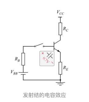pn结正偏时会储存一定的电荷,产生一定的电容效应。当BJT的基极在外部关断时,发射结上的压降不会马上就降低到0,而是会被这个电容维持住,如下图所示: