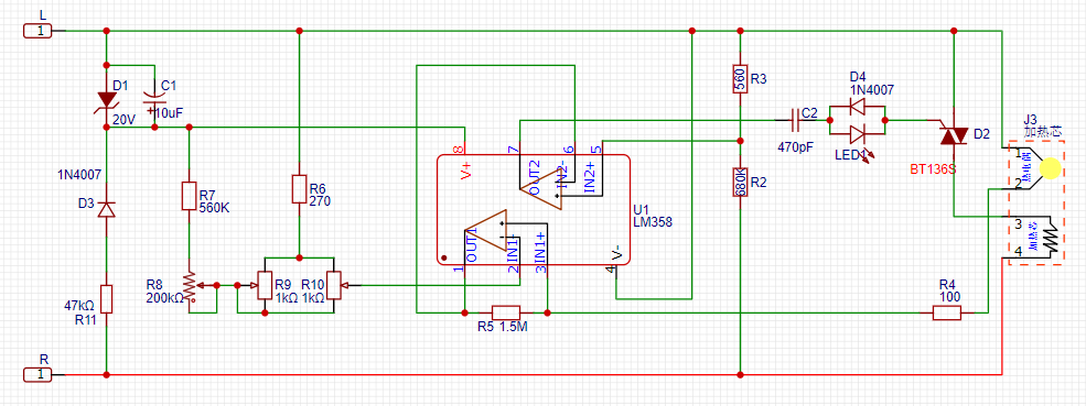 供电 整流后的电压一路供给LM358(双路运算放大器)的8脚(LM358 V+)上面,另外一路给调温电路。