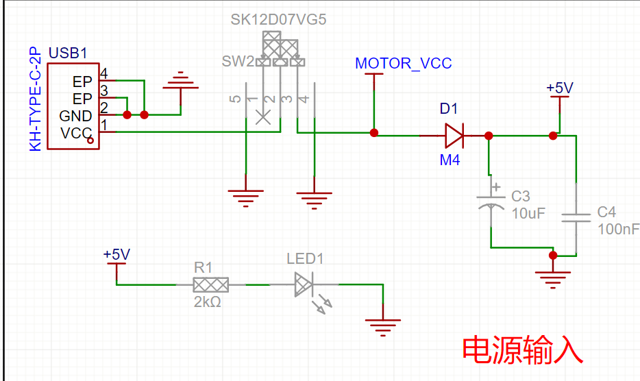 直接使用一个 TYPE-C 接口输入 5V 电源,通过开关进行控制。其中有两个电源信号:MOTOR_VCC 和 +5V。 MOTOR_VCC 是直接将TYPE-C的电源接入电机正负极。 +5V 是由 MOTOR_VCC 经过一个防倒灌二极管 U12 后的电源,该电源接入到开发板的5V上,为开发板供电。