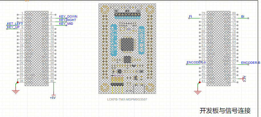 开发板的输入电源是+5V,因为开发板本身自带了5V降压3.3V的功能,所以直接接出3V3到编码器的电源输入。 电机控制信号 BI\FI 必须接入支持PWM功能的引脚,原理图中选择了 GPIOA26 和 GPIOA27。GPIOA26 选择通过 TIMG7-C0 输出PWM,GPIOA27 选择通过 TMG7-C1 输出PWM。按键可以选择任意的GPIO口。
