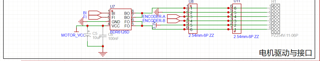 电机驱动芯片U7,使用的是由巴丁微电子生产的 BDR6126D ,这是一款大功率直流电机驱动芯片,最高输入 18 V ,最大持续输出电流 4.5 A。考虑到大多数的编码器电机接口线序不一致的问题,在原理图中就放置了3种线序。如果接口不对,也安排了排针接口,自己接。