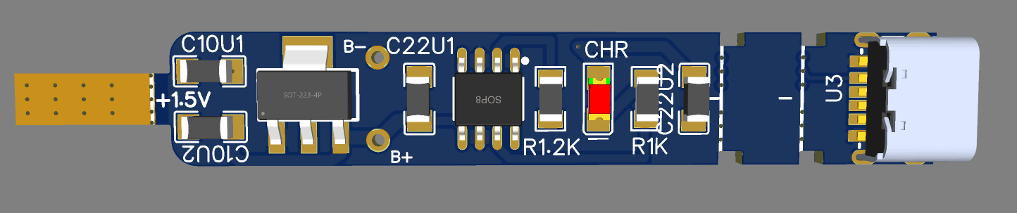 将芯片做成5、7号电池样子,接上3.7V电池,实现Type-C直接充电,1.5V放电。 将AMS1117改为ME6206,待机消耗降低,最大输出0.5A,基本够用 芯片bom可能有误,看板子标注就行