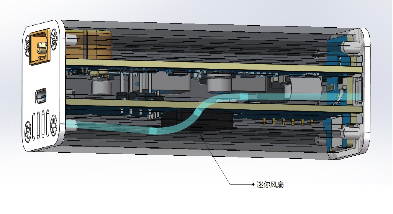 我在设计的时候还加入了一个迷你风扇,颜色线条代表风道。