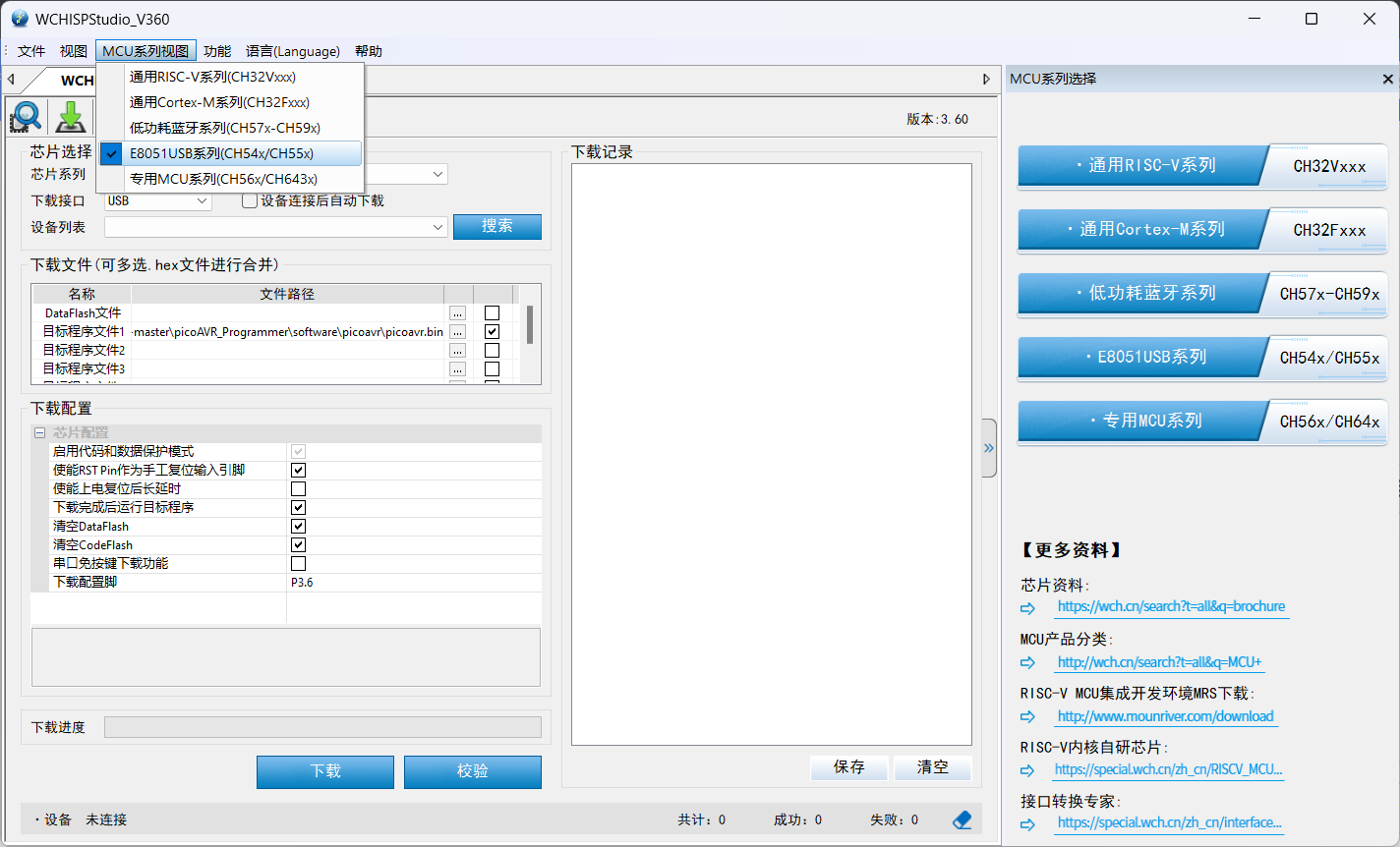 - 打开WCH ISP Studio, 在“MCU系列视图”中选择“E8051USB系列(CH54X/CH55X)”