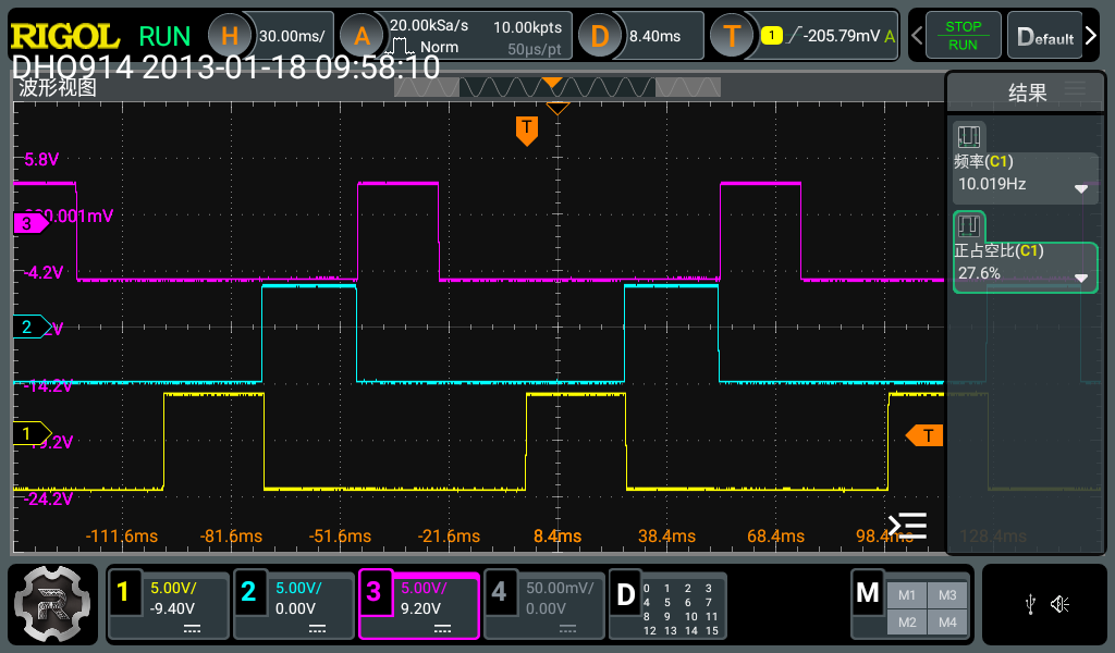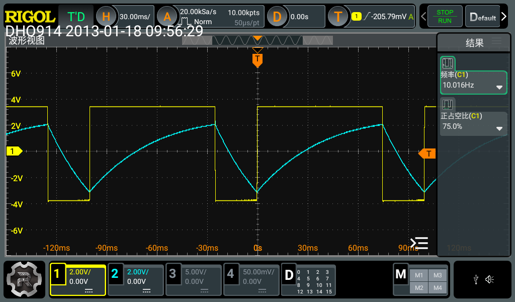 使用运放搭建振荡电路产生10Hz方波,通过调整同相输入端电压调整占空比到75%,此方波可以通过接口CH1测量。