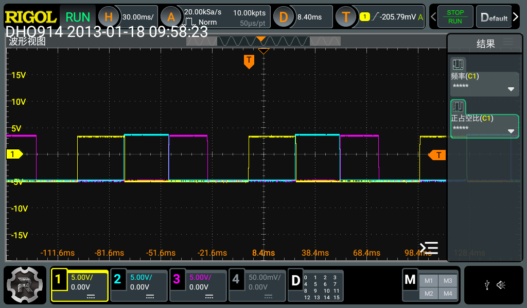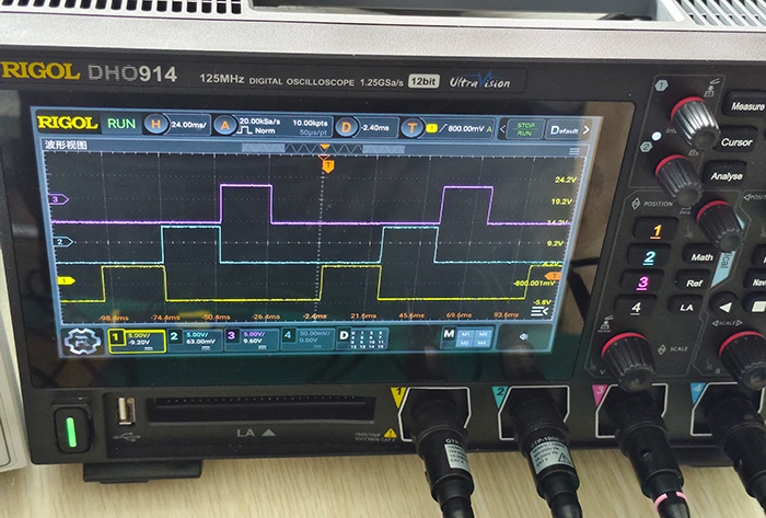 方波经过积分电路后产生锯齿波,通过反相放大器翻转信号并放大其幅值,满足题目大于6V幅值的要求,锯齿波可以通过接口CH2测量。