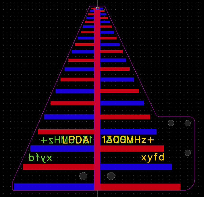 简介:工作频率大概在1.3g到12g的对数周期天线,增益5db左右,已使用VNA测试过,性能良好(高频性能受馈线影响,不保证8g以上的效果),板厚为1.6mm,其他厚度会影响性能,需要自行在正面尖端焊接馈线开源协议