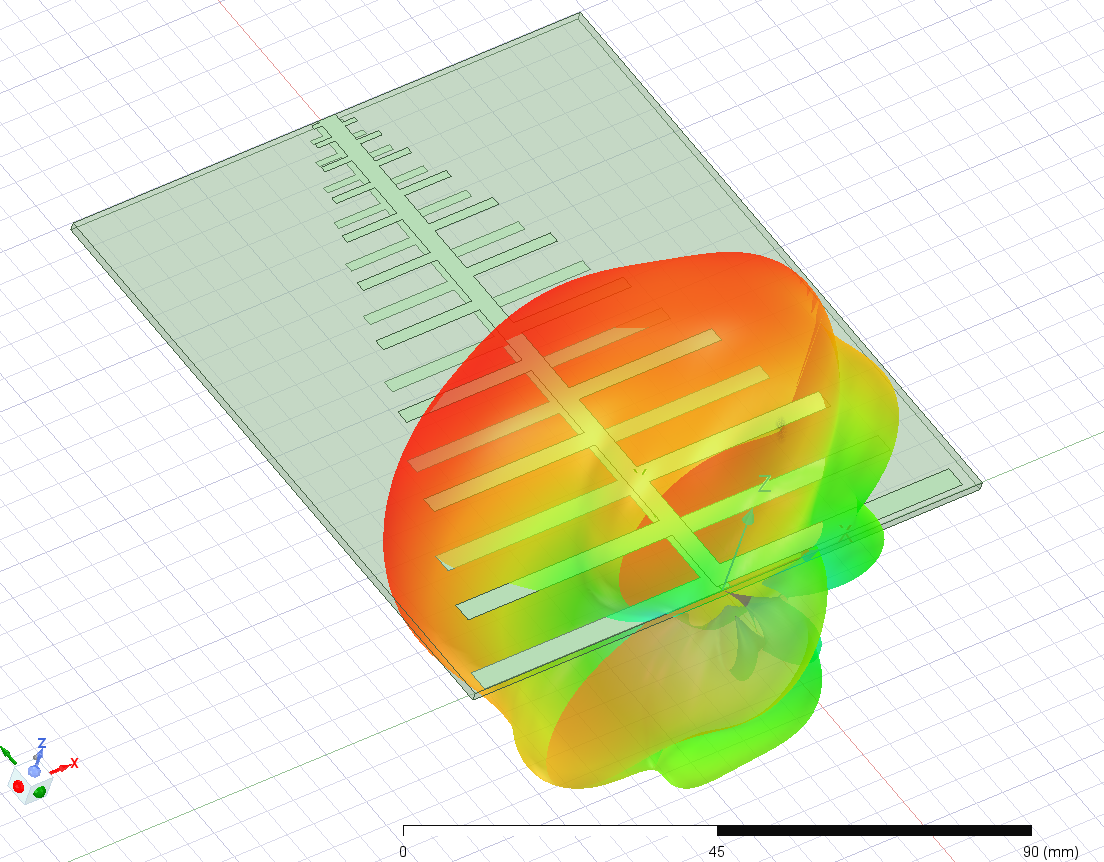 工作频率大概在1.3g到12g的对数周期天线,增益5db左右,已使用VNA测试过,性能良好(高频性能受馈线影响,不保证8g以上的效果),板厚为1.6mm,其他厚度会影响性能,需要自行在正面尖端焊接馈线
