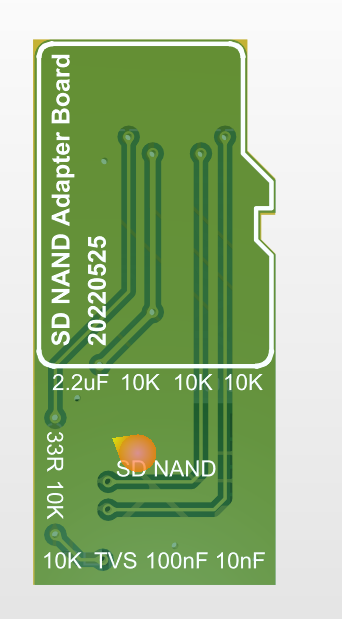所有元件都在正面,TVS管是SOT-323封装 电压不小于3.3V,SD NAND是创世的SD NAND,阻容封装是0402,大小在背面有写。在立创都买的到。