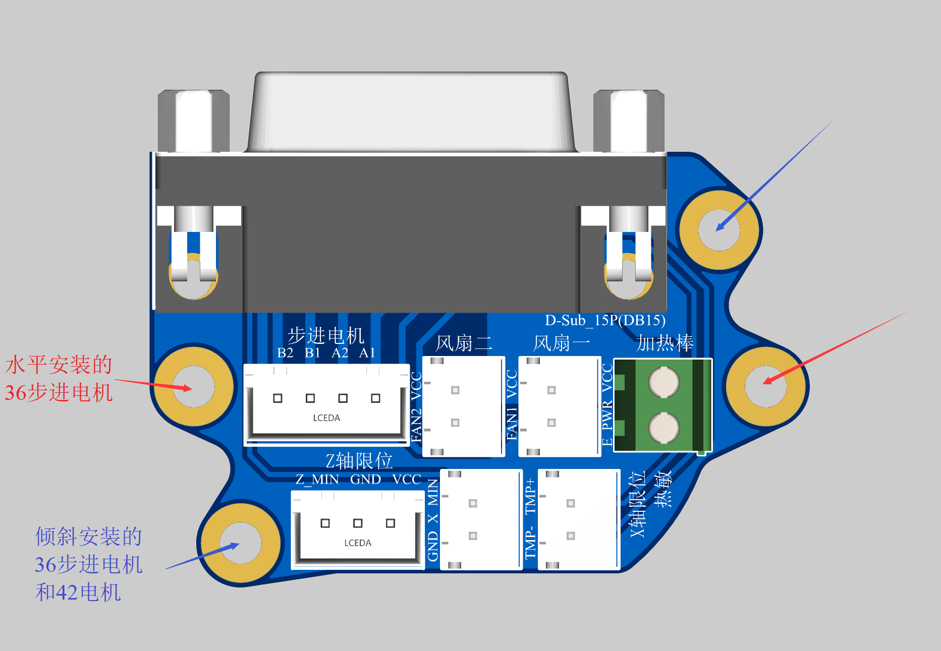 固定孔位包括水平和倾斜两种,方便使用M3铜柱固定在水平的36电机:如HGX挤出机、大鱼TT等,和斜的36电机:如Sherpa挤出机、FZai挤出机的后部。保证D-Sub接口朝上,效果如图所示。