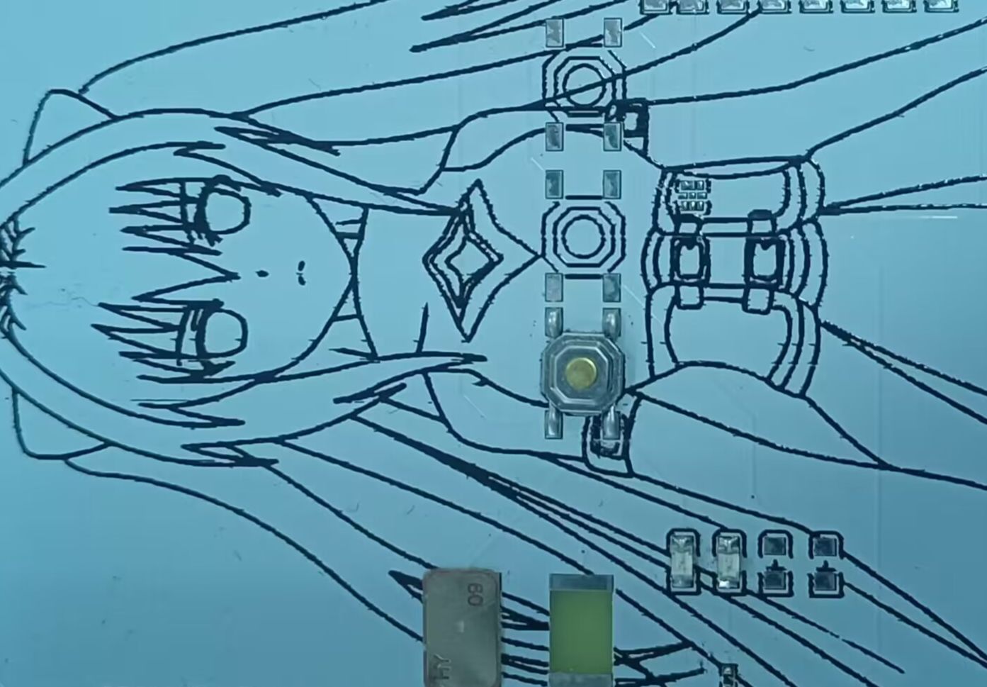 这个项目正面是四川铁道职业学院的校徽和嘉立创EDA图标,背面为了好看设计了一个美少女的图片,周围设计了2个红光led灯,由轻触开关控制芯片的感应。