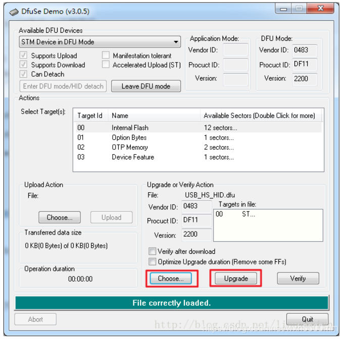 打开 DfuSeDemo 软件(附件中有),点击Choose 按钮,找到下载回来的 .dfu 固件,然后点击 Upgrade 按钮即可。如下图所示: