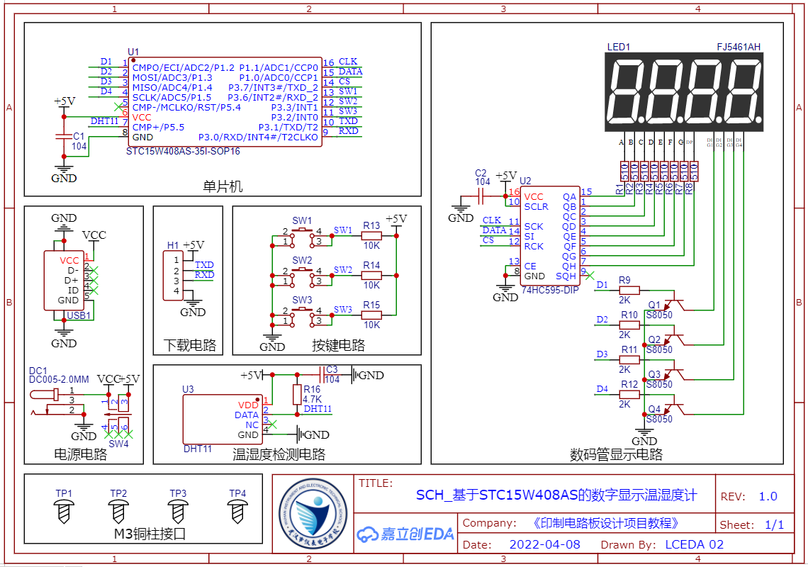 图3-1 基于STC15W408AS的数字显示温湿度计原理图